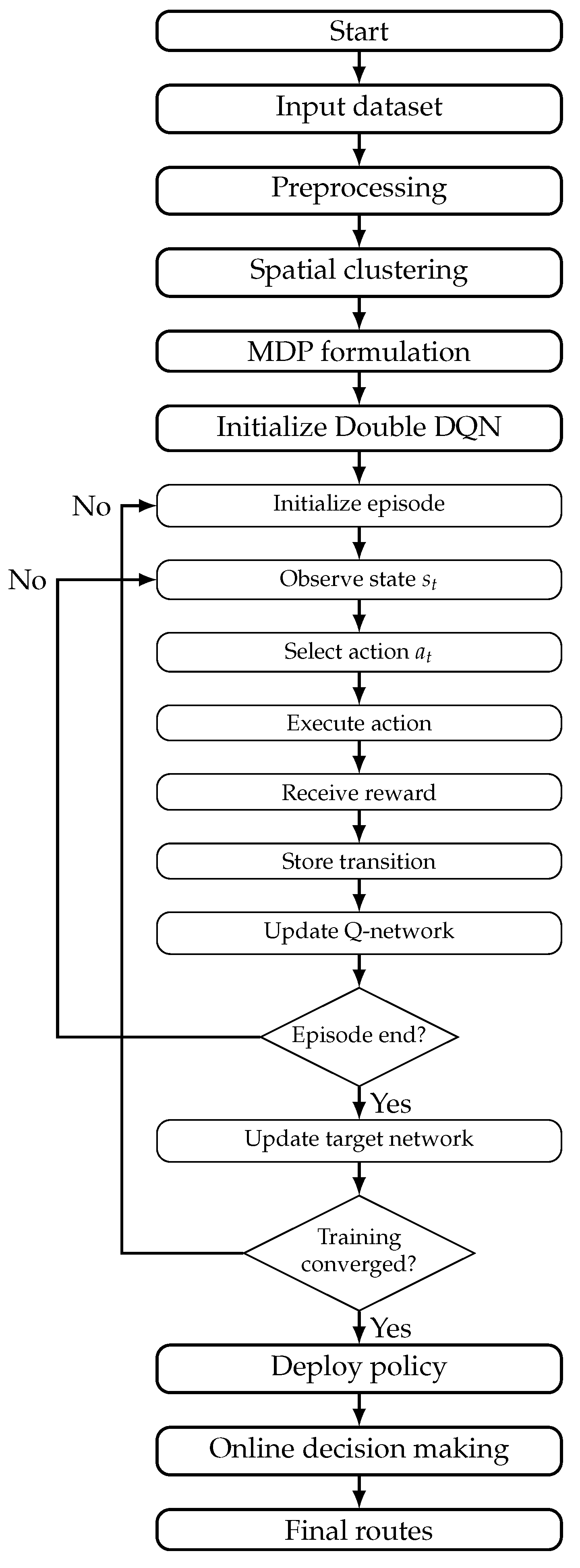 26]. In line with these studies, the present work adopts DDQN as a stable value-based learner and focuses on its deployment within a realistic and scalable D-EVRP simulation setting, rather than proposing a new learning architecture.