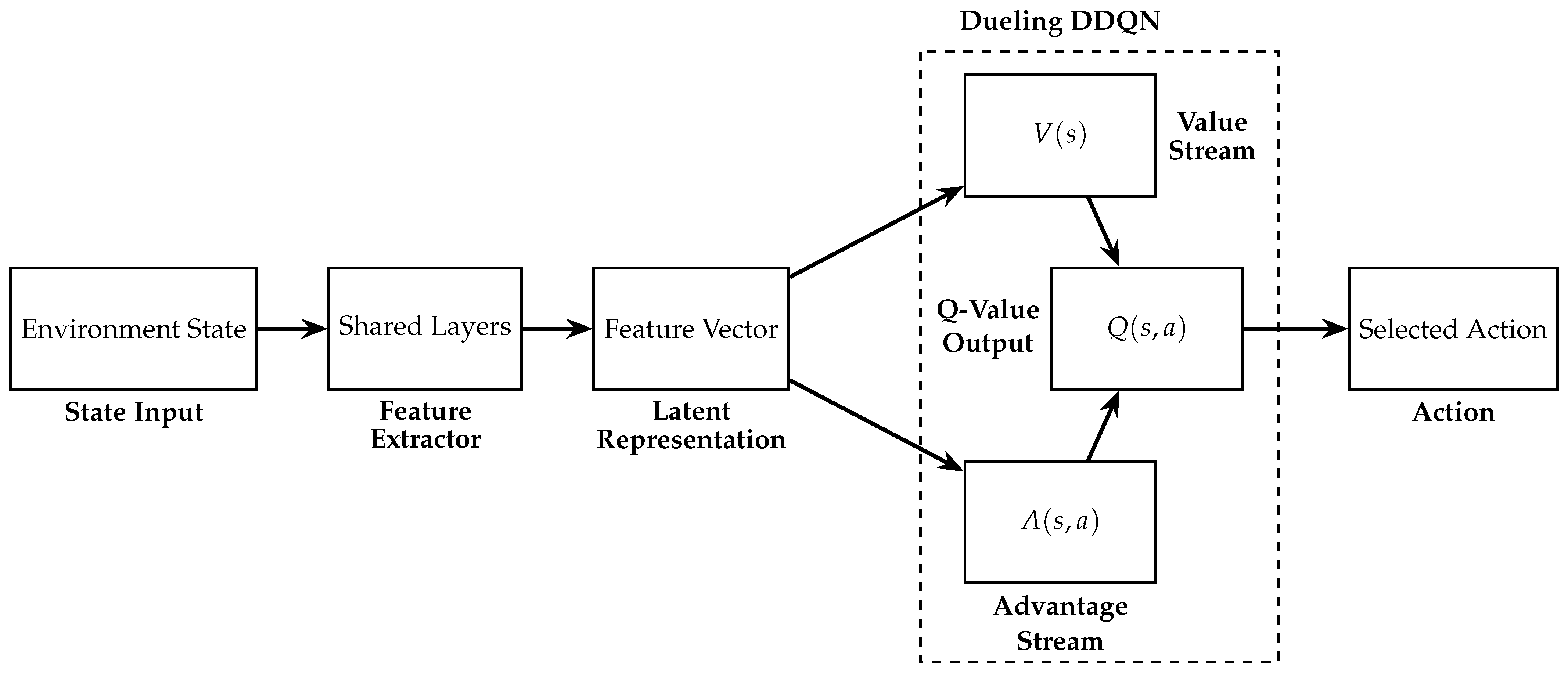 The action–value function is computed using the dueling architecture defined in Equation (1), which ensures that the advantage values are identifiable while preserving the relative preferences among actions. The next action is selected using the online network, whereas its value is evaluated using the target network, a modification demonstrated by Van Hasselt et al. [