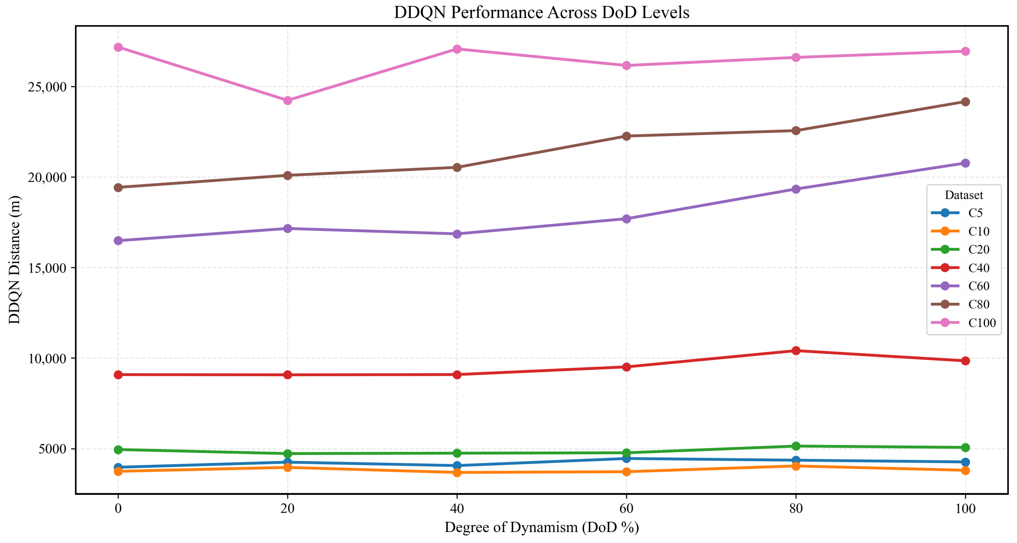 Figure 5 illustrates how DDQN route distances change under different dynamism levels. The figures shown vary with the dataset size. In the smallest clusters (C5 and C10), distances remain within a narrow range and show only slight increases as DoD increases. This suggests that dynamic arrivals have a limited impact. In the medium clusters (C20 and C40), the curves increase more steadily, and as dynamism strengthens, differences in route preferences begin to appear. The largest datasets (C60, C80, C100) show a clearer upward trend, with distances increasing almost continuously with DoD. This is a natural consequence, as it complicates the problem. As more customers increase the randomness of their requests, this increases their impact. Even so, the curves remain smooth, suggesting that the DDQN policy updates routes in a controlled manner. Overall, the figure demonstrates that DDQN remains stable across all sizes, with distance increasing gradually as dynamicity grows, and the effect becoming more pronounced in larger, high-density scenarios.