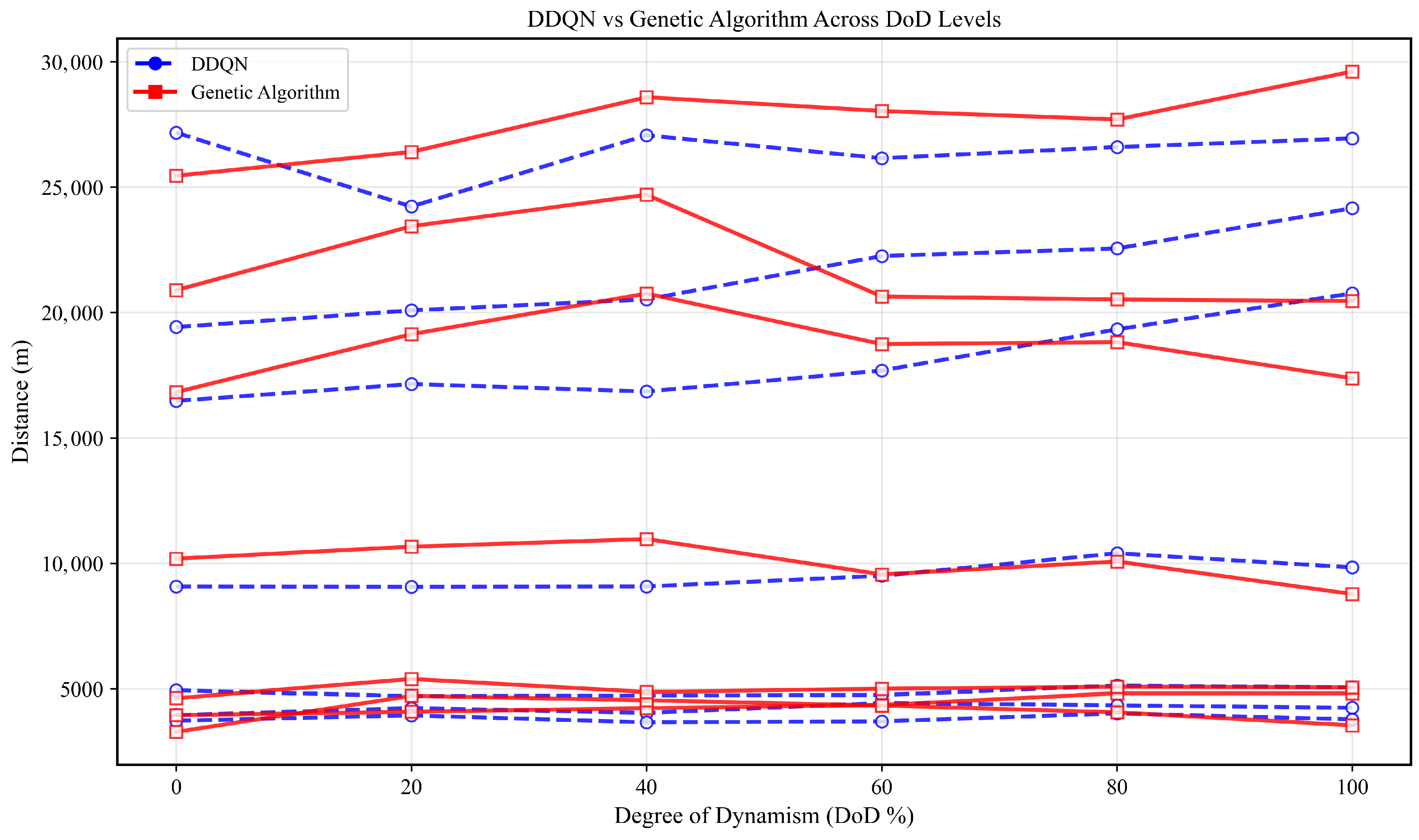 Figure 6 compares the behavior of DDQN and the Genetic Algorithm (GA) across the same DoD spectrum and datasets. The contrast between the two approaches reveals clear performance differences that depend on problem scale and dynamism intensity. In small datasets (C5–C20), the DDQN curves consistently appear below the GA curves, indicating that DDQN achieves shorter overall routes under dynamic conditions. The GA trajectories in this region show larger oscillations, suggesting that population-based search becomes less stable when the number of tasks is small but the arrival times shift unpredictably. In medium-sized datasets (C40 and C60), the distance values of the two methods remain closer, though GA still produces higher costs in most DoD levels. The divergence becomes more marked around 40–80% DoD, where GA exhibits stronger upward swings. This pattern suggests that the increased number of dynamic insertions and relocations interacts negatively with GA’s iterative search mechanism, occasionally pushing solutions toward suboptimal local structures. In the largest dataset (C100), GA consistently produces the highest distance values across all DoD levels. DDQN, although affected by increasing dynamism, maintains a more controlled growth pattern. This behavior highlights the comparative advantage of learning-based policies in large-scale, high-volatility scenarios, where rapid adaptation is required. The GA, by contrast, shows sensitivity to both scale and dynamism, resulting in inflated routing costs as problem complexity intensifies. Overall,