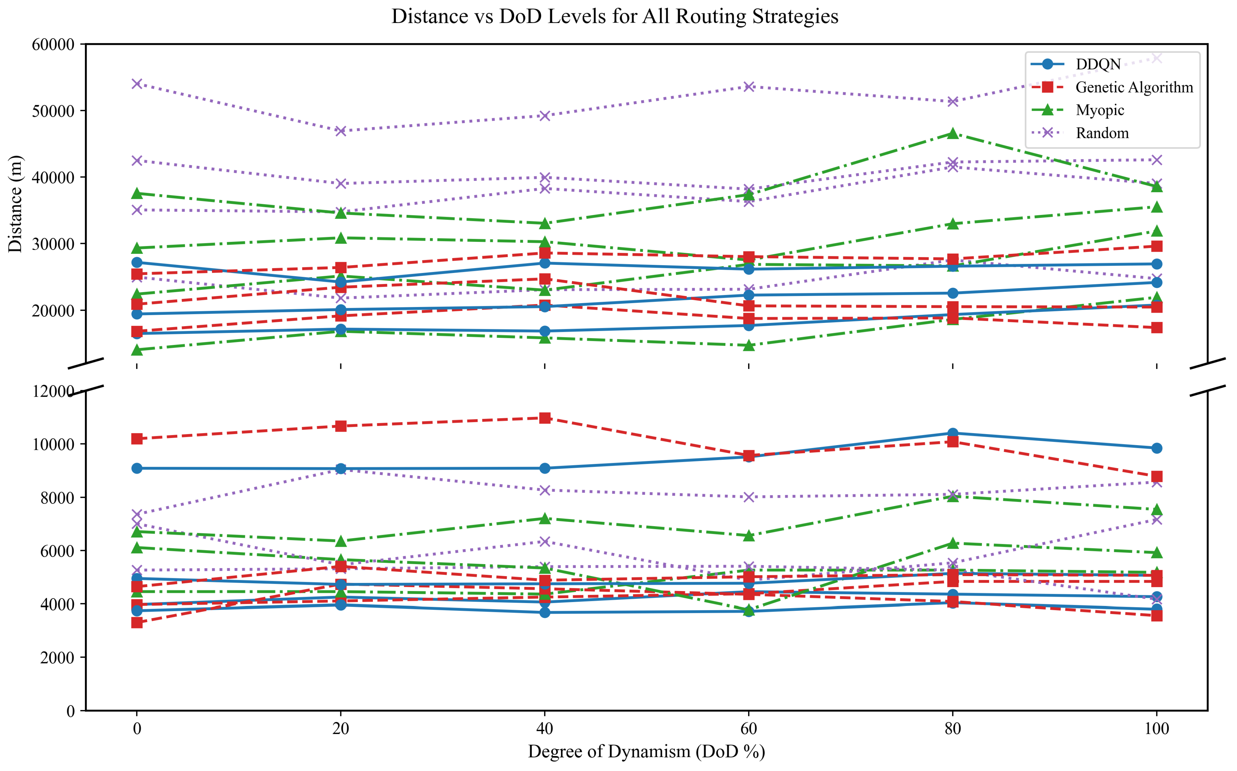 Figure 7 shows how total travel distance varies with the degree of dynamism (DoD) across four methods: DDQN, Genetic Algorithm, Myopic, and Random. Clear patterns emerge. DDQN consistently achieves the lowest and most stable distances in all datasets, with only modest increases as DoD rises. This indicates that the learned value-based policy absorbs real-time requests without sharp growth in travel cost. The Genetic Algorithm produces slightly higher distances than DDQN but still follows a controlled trend. While GA adapts to dynamic insertions through periodic re-optimization, its population-based updates introduce small fluctuations.