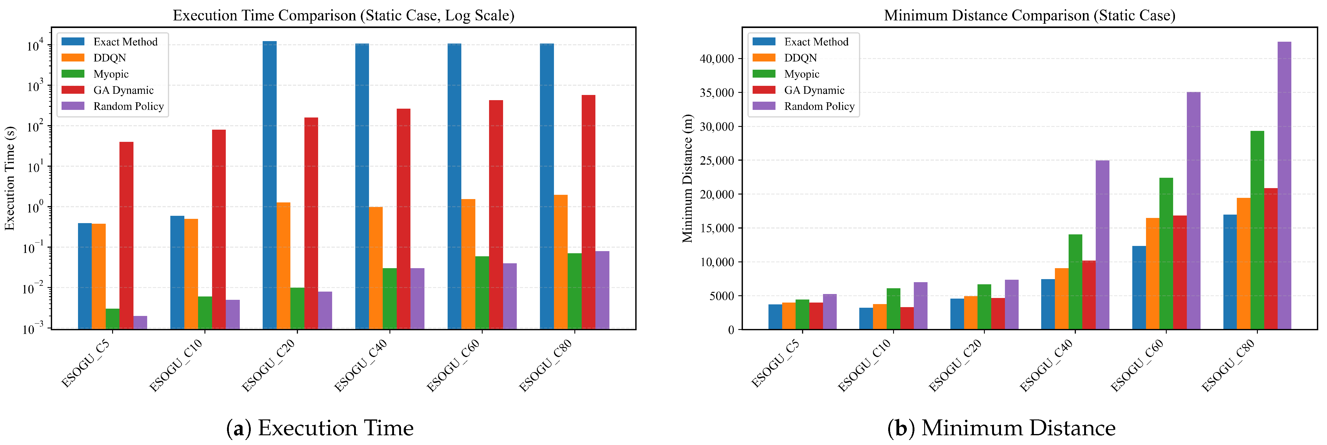 All methods are evaluated under a fully normalized experimental protocol to ensure fair comparison. Specifically, Random, Myopic, Genetic Algorithm, and DDQN policies operate on the same datasets, share identical customer locations, charging infrastructure, vehicle specifications, and feasibility constraints, and are exposed to the same degree of dynamism scenarios. Dynamic request arrivals follow the same predefined schedules across all methods. No method is provided with additional foresight or privileged information beyond what is inherently assumed by its decision mechanism. Performance is assessed using the same evaluation metrics, primarily total travel distance and execution time, allowing direct and consistent comparison across all approaches.