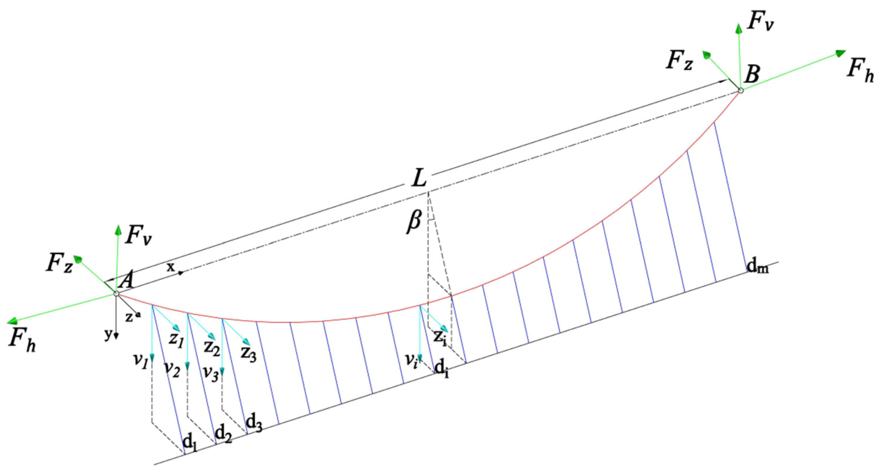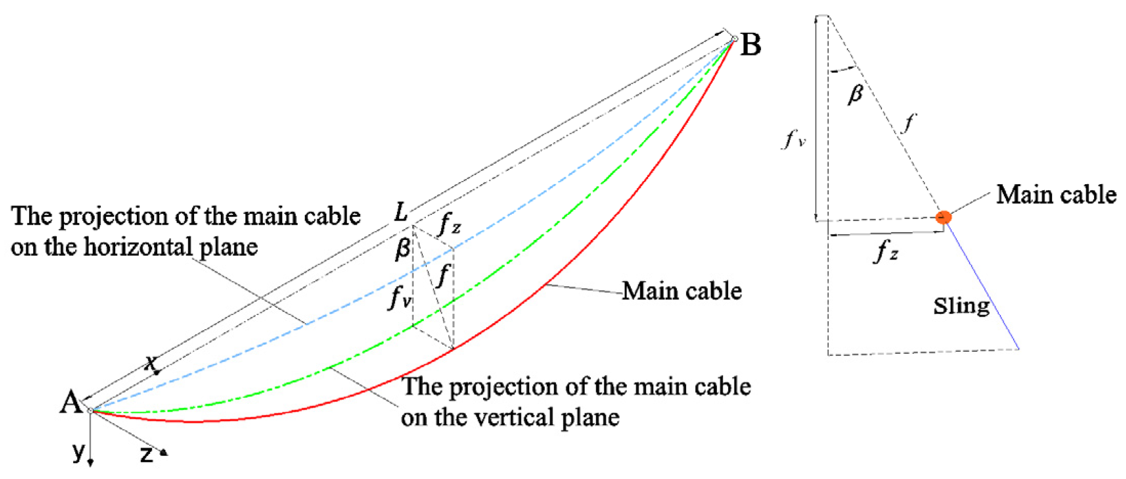 The projections of the spatial main cable in the vertical and horizontal planes are shown in Figure 4. In the figure, β represents the angle between the inclined plane of the main cable and the vertical plane, n denotes the sag-to-span ratio, f is the sag of the spatial main cable, and L is the span length of a single main span. fv represents the sag of the main cable profile projected onto the vertical plane, given by fv = f cosβ, while fz represents the sag of the main cable profile projected onto the horizontal plane, given by fz = f sinβ.