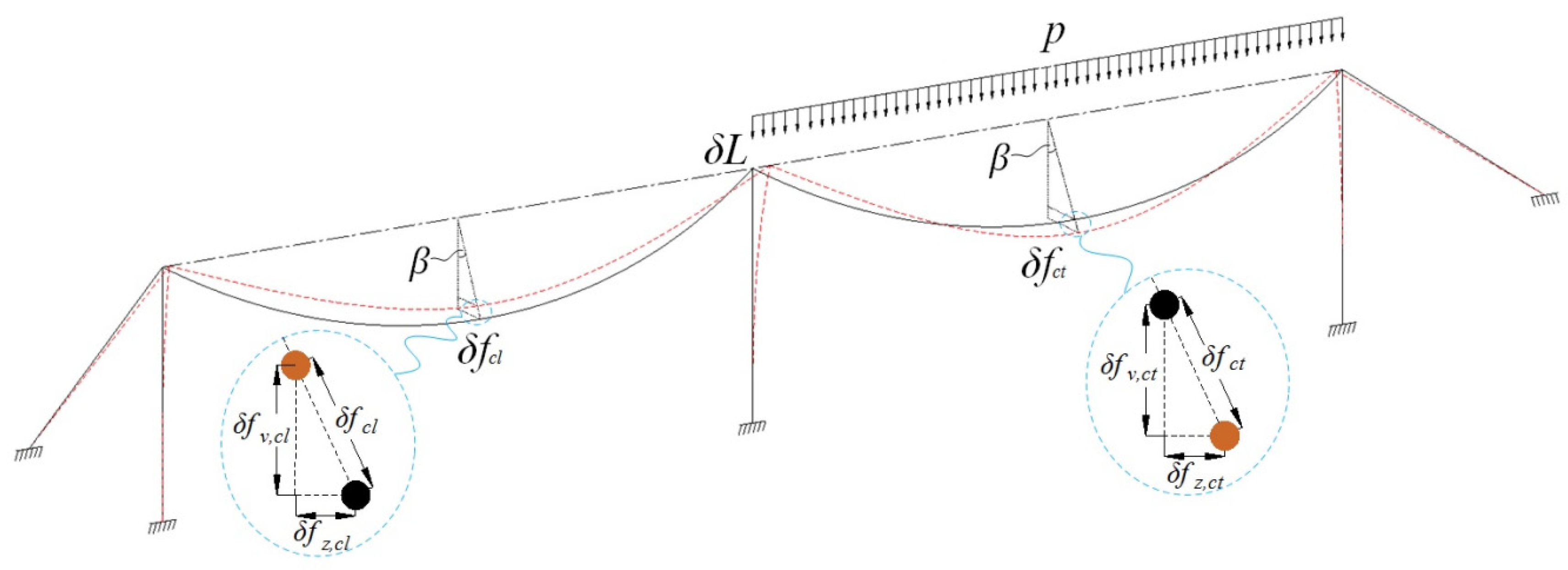In Equation (18), the change in the sag of the main cable in the loaded span δfv,ct consists of two components: one is the change in the sag δft,p caused by the displacement of the tower top δL, and the other is the change in the sag δfe,p resulting from the elongation of the main cable under live load. Therefore, δfv,ct can be expressed as: