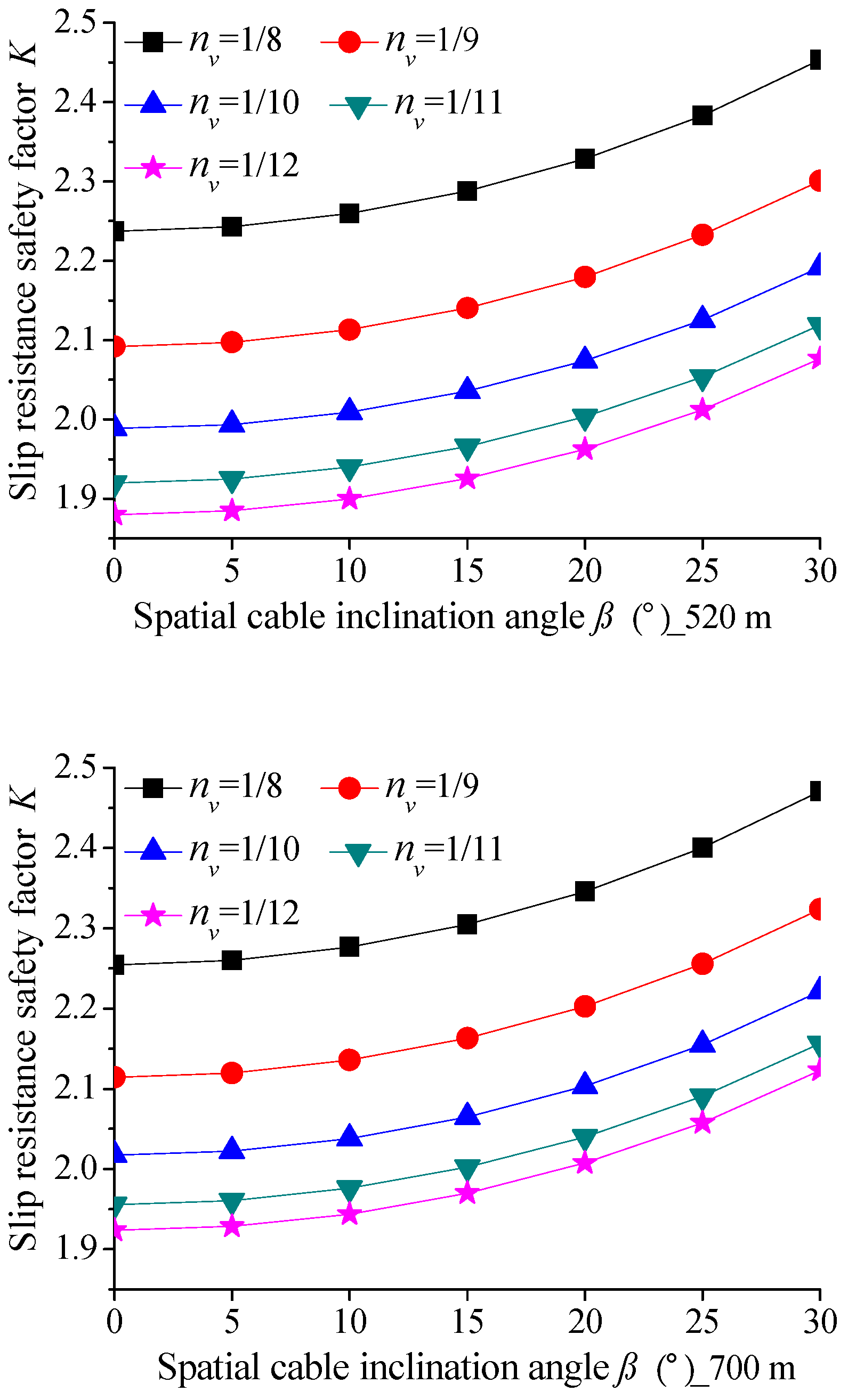 The adoption of spatial cables improves the anti-slip stability of the main cable, and the anti-slip safety factor increases with the spatial inclination angle of the main cable. The anti-slip safety factor decreases as the tower–cable stiffness ratio increases. When the tower–cable stiffness ratio Kt/Kc < 3, an increase in the stiffness ratio results in a rapid decline in the anti-slip safety factor K. When the tower–cable stiffness ratio exceeds 12, further increases in the stiffness ratio have a minimal impact on the anti-slip safety factor.