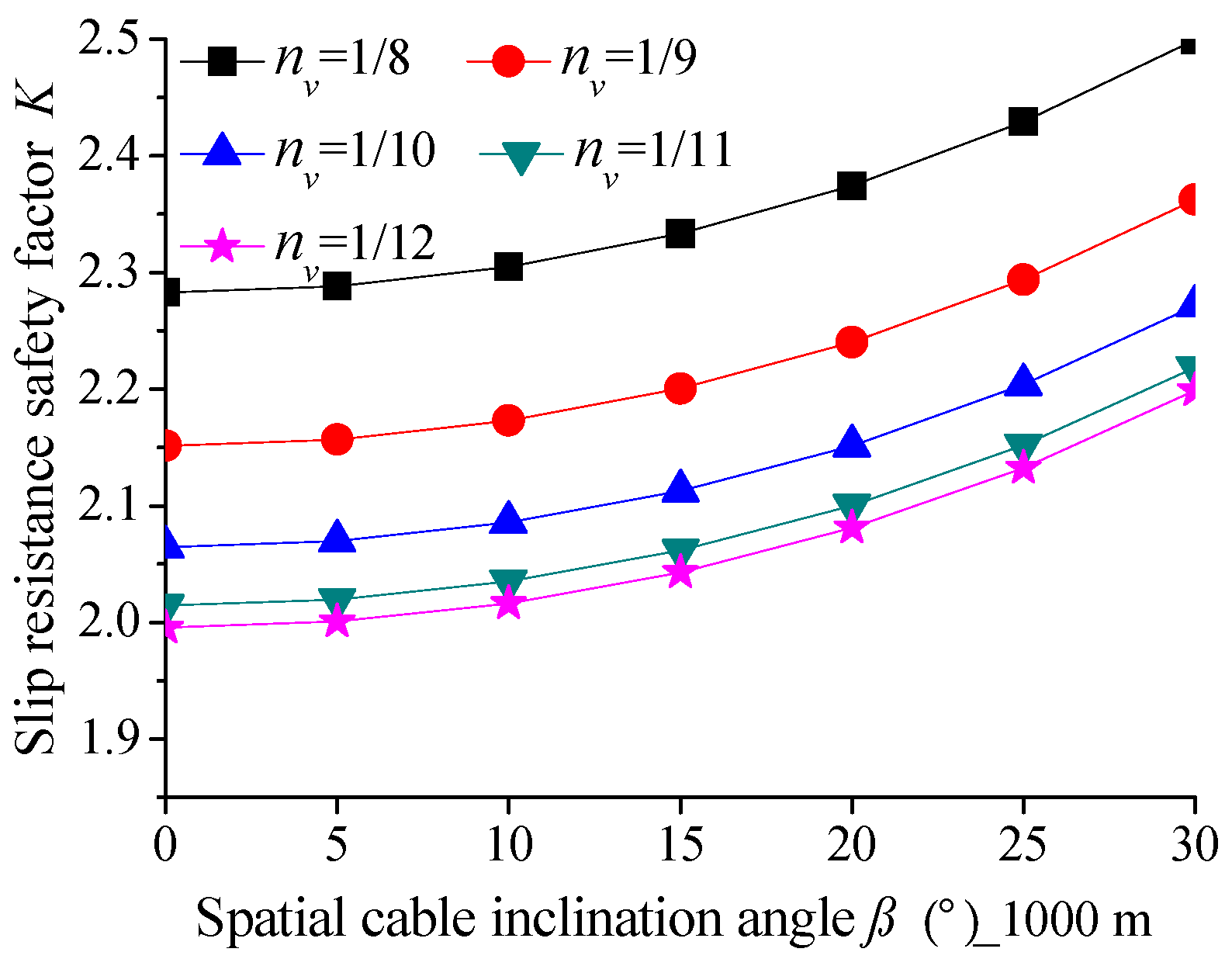 Figure 12. Influence of the spatial main cable inclination angle on the anti-slip safety factor of the main cable.