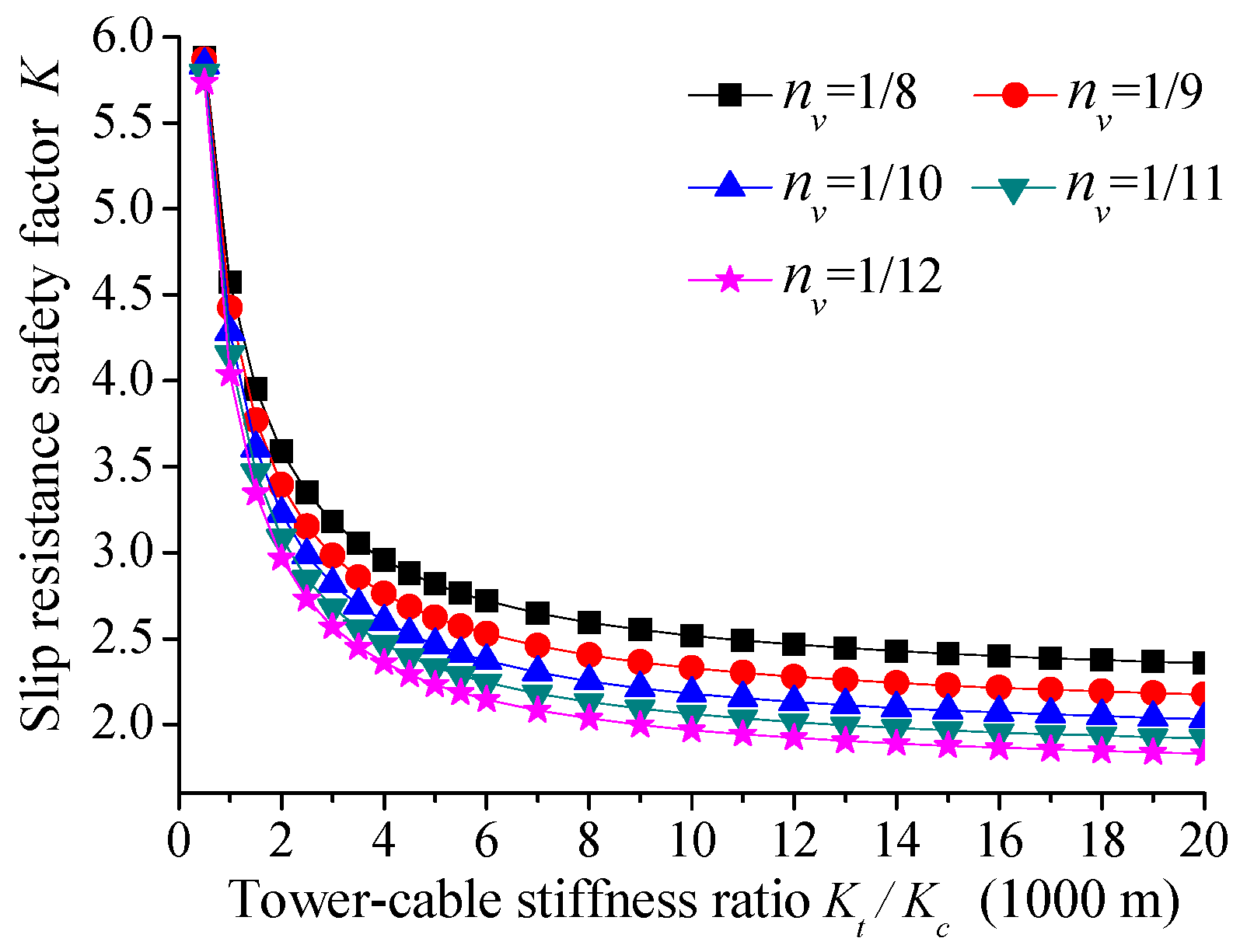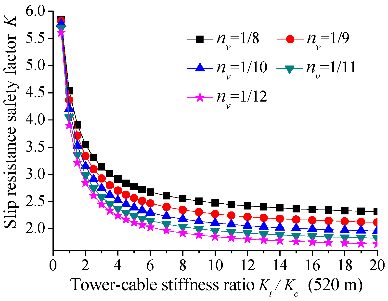 Figure 13. Influence of tower–cable stiffness ratio and sag-to-span ratio on the anti-slip safety factor of the main cable.