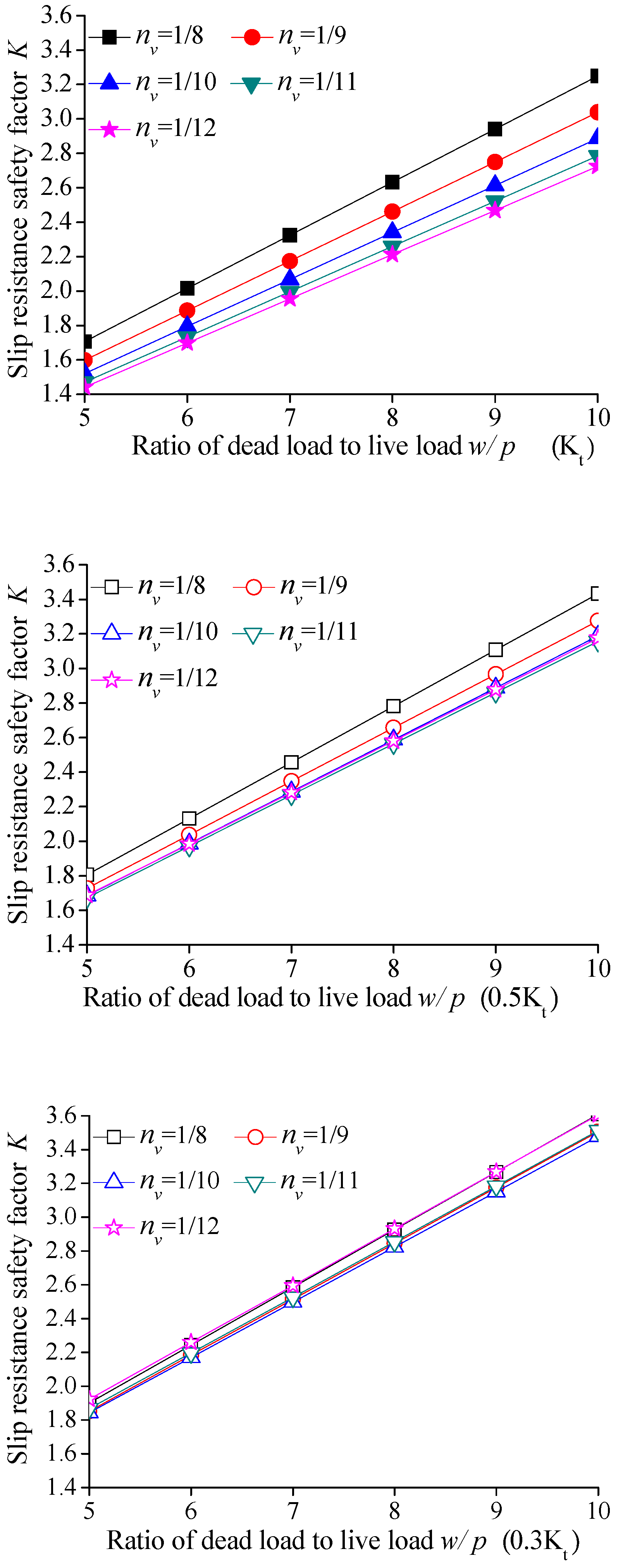 Variations in dead load modify the longitudinal restraint stiffness of the main cable, thereby altering the tower–cable stiffness ratio. To isolate the influence of the tower–cable stiffness ratio, the dead load was held constant, and the dead-to-live load ratio was adjusted by varying the live load. Three tower stiffness scenarios were investigated for sag-to-span ratios nv of 1/8, 1/9, 1/10, 1/11, and 1/12: (1) constant tower stiffness: Kt = 71,429 kN/m, with other parameters unchanged; (2) reduced tower stiffness: 0.5 Kt = 35,714 kN/m, with other parameters unchanged; (3) further reduced tower stiffness: 0.3Kt = 21,428 kN/m, with other parameters unchanged. The friction coefficient μ between the main cable and saddle was set to 0.3. The computational results are presented in Figure 14.
