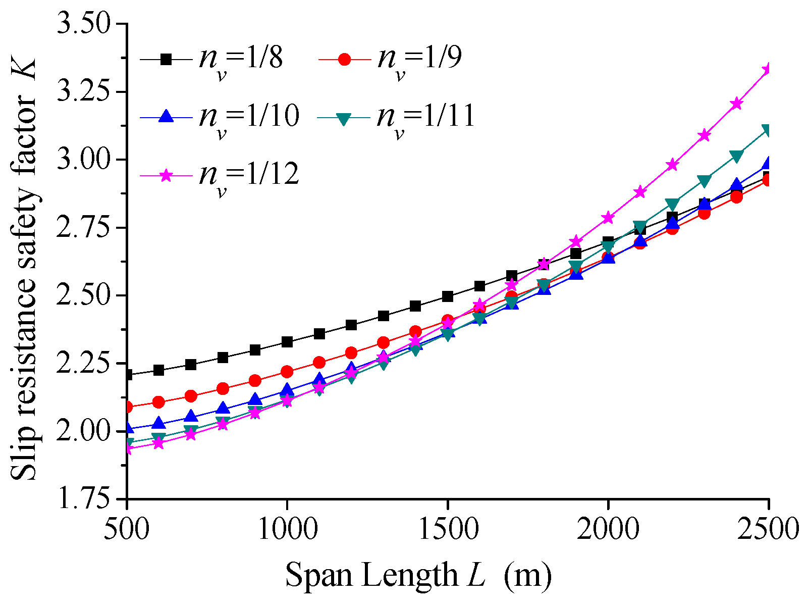 To investigate the relationship between the anti-slip safety factor of the main cable and the span length, the span length L was varied from 500 to 2500 m, while the sag-to-span ratio nv was set to 1/8, 1/9, 1/10, 1/11, and 1/12. The live load p was fixed at 30 kN/m, and the friction coefficient μ between the main cable and saddle was set to 0.3. When adjusting the span length and sag-to-span ratio, the cross-sectional area of the main cable was also modified to maintain a constant stress in the main cable under dead load. The computational results are presented in Figure 15.