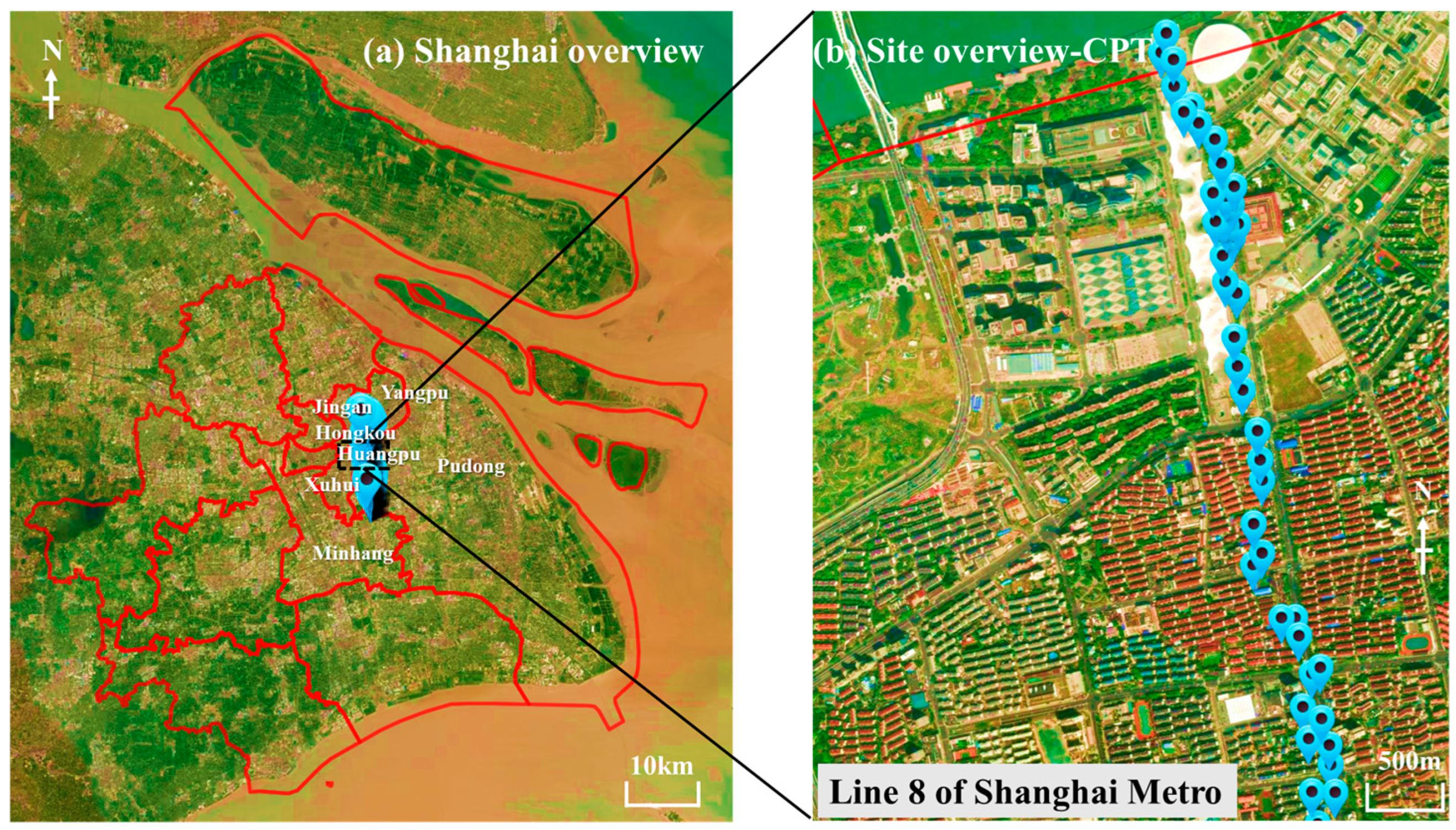 Figure 1. It can be seen that the CPT soundings were mainly collected from the construction sites (e.g., metro tunnel, deep excavation) in the urban area of Shanghai, such as the Xuhui, Huangpu, and Hongkou Districts. All CPT data were extracted using Getdata V2.24 software, with measurements recorded at intervals of 0.1 m. The soil profiles encompass nine major soil types, including fill, clay, silt, and sand. In this study, these are uniformly labeled as soil Type 1 to soil Type 9. Although some soil layers contain sub-layers, they are not differentiated in this study, with all soils being classified into the nine main types.