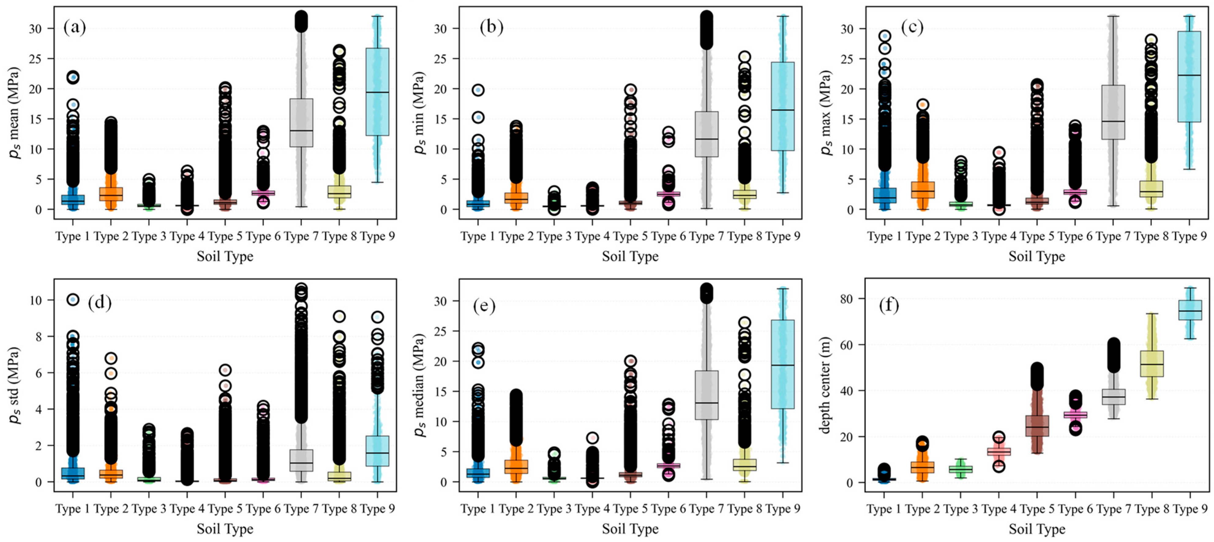 ps mean, minimum, maximum, standard deviation, median, and depth center—across nine soil types. Overall, the distributions show a clear mechanical and stratigraphic gradient among the soil categories. Soil Types 1~3 generally exhibit low to moderate strength values, with relatively wide dispersion, indicating heterogeneous but comparatively weak materials. Soil Types 4 and 5 present the lowest strength levels across all metrics and limited variability, suggesting uniform soft soils. In contrast, Soil Types 6~9 display substantially higher strength characteristics, with Types 7 and 9 reaching the highest ranges in both central tendency and extrema. These stronger soils also occur at greater depths, as reflected by the depth-center patterns, which increase progressively from Type 1 to Type 9. Together, the six features consistently differentiate the upper, weaker soils from the deeper, stronger units, highlighting a coherent transition in mechanical behavior across the nine soil types. The wide and overlapping depth ranges of different soil types indicate strong stratigraphic undulation among the CPT soundings, highlighting the necessity of incorporating depth-related features to account for variations in layer thickness and topographical conditions.