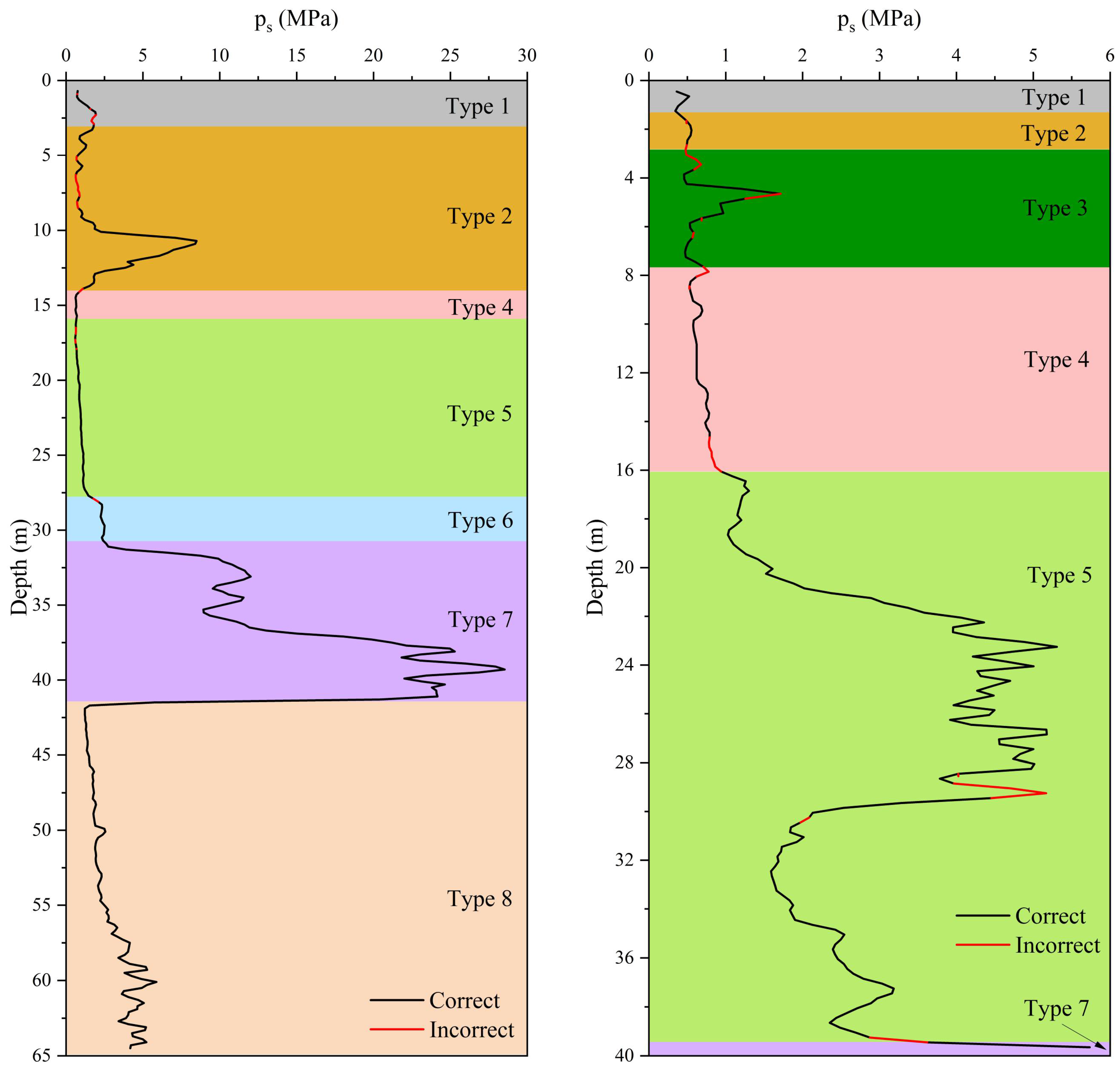 ps is plotted against depth along with the predicted correctness. The black segments denote depths where the soil type is correctly classified, whereas red segments indicate misclassification. And each type of soil’s actual label corresponds to a specific color. The different ranges of penetration resistance observed in