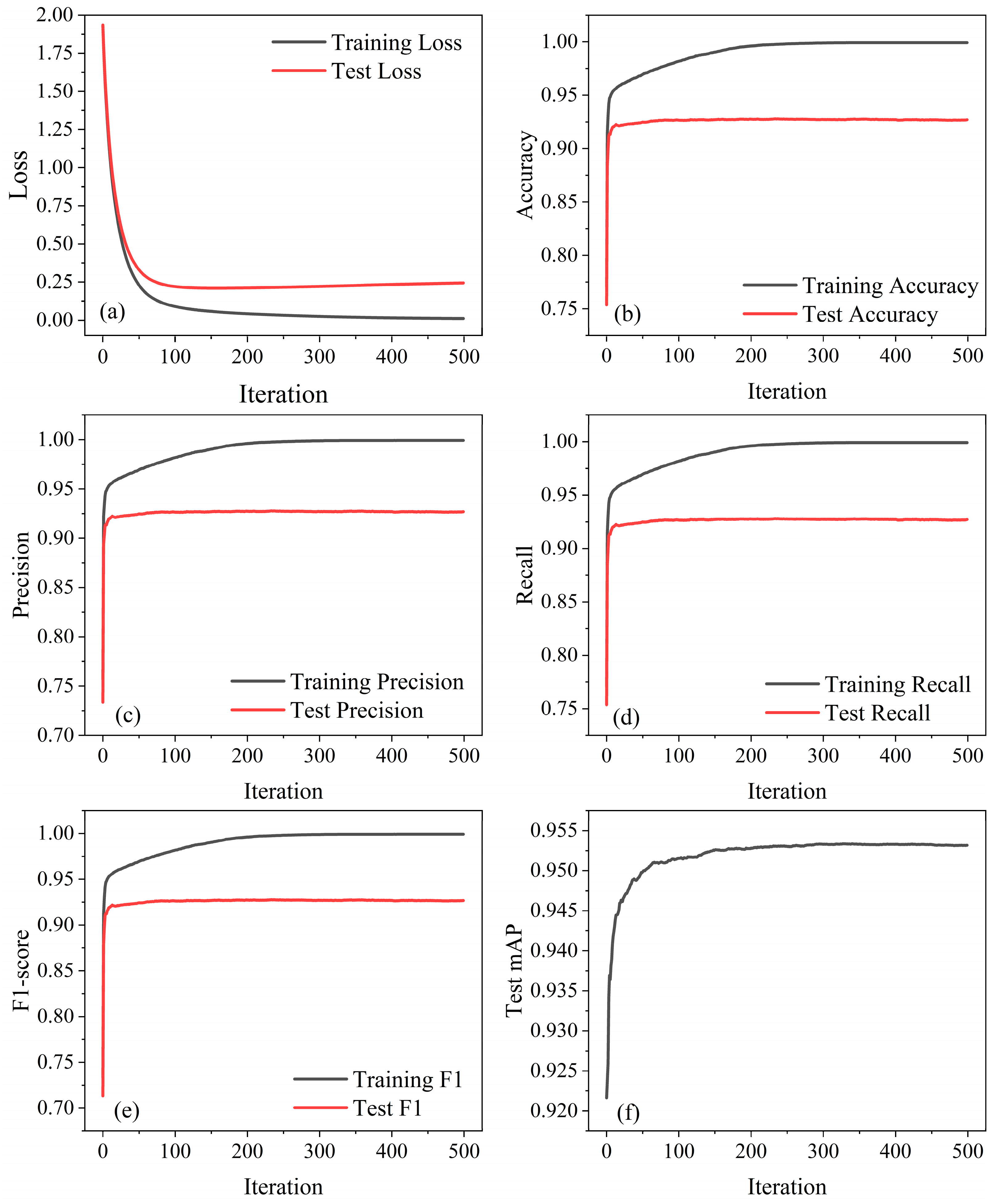 Figure 6e illustrates that the training F1-score approaches 1.0, while the test F1-score stabilizes around 0.926, consistent with the trends of precision and recall. In CPT-based soil classification, the F1-score is an effective indicator of model robustness across imbalanced soil categories and confirms the model’s stable performance across different soil behavior types.