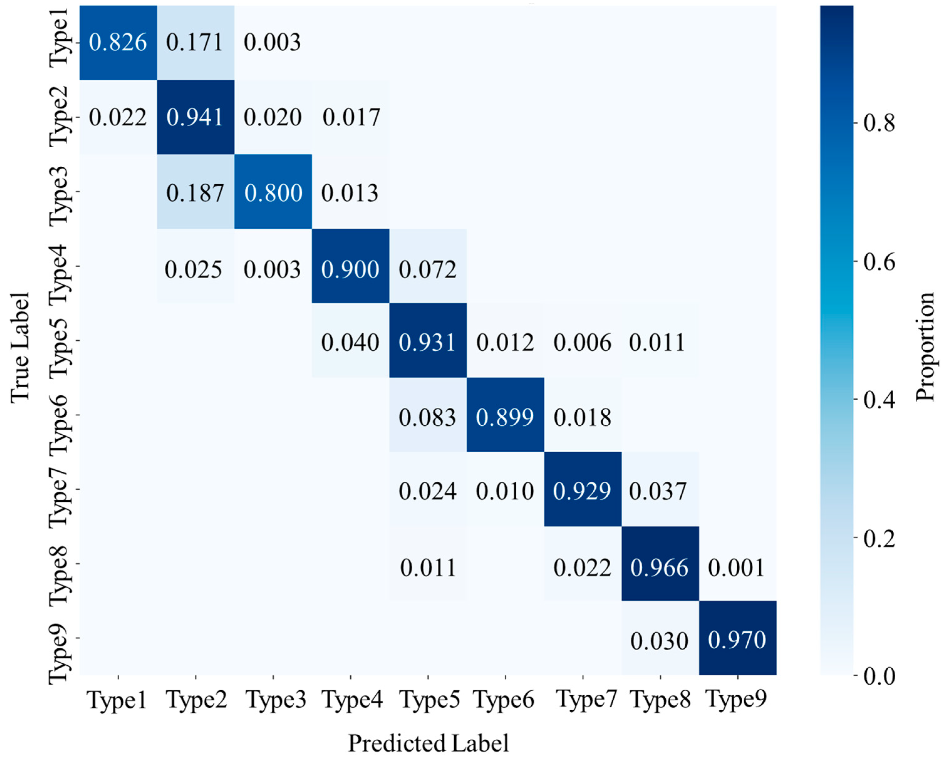 Figure 8. The model achieves an overall mean Average Precision (mAP) of 0.954, indicating consistently strong discriminative performance across all soil types. The AP values range from 0.844 (Type 3) to 1.000 (Type 9), reflecting both the inherent separability of individual soil categories in the CPT feature space and the influence of sample size and soil heterogeneity.