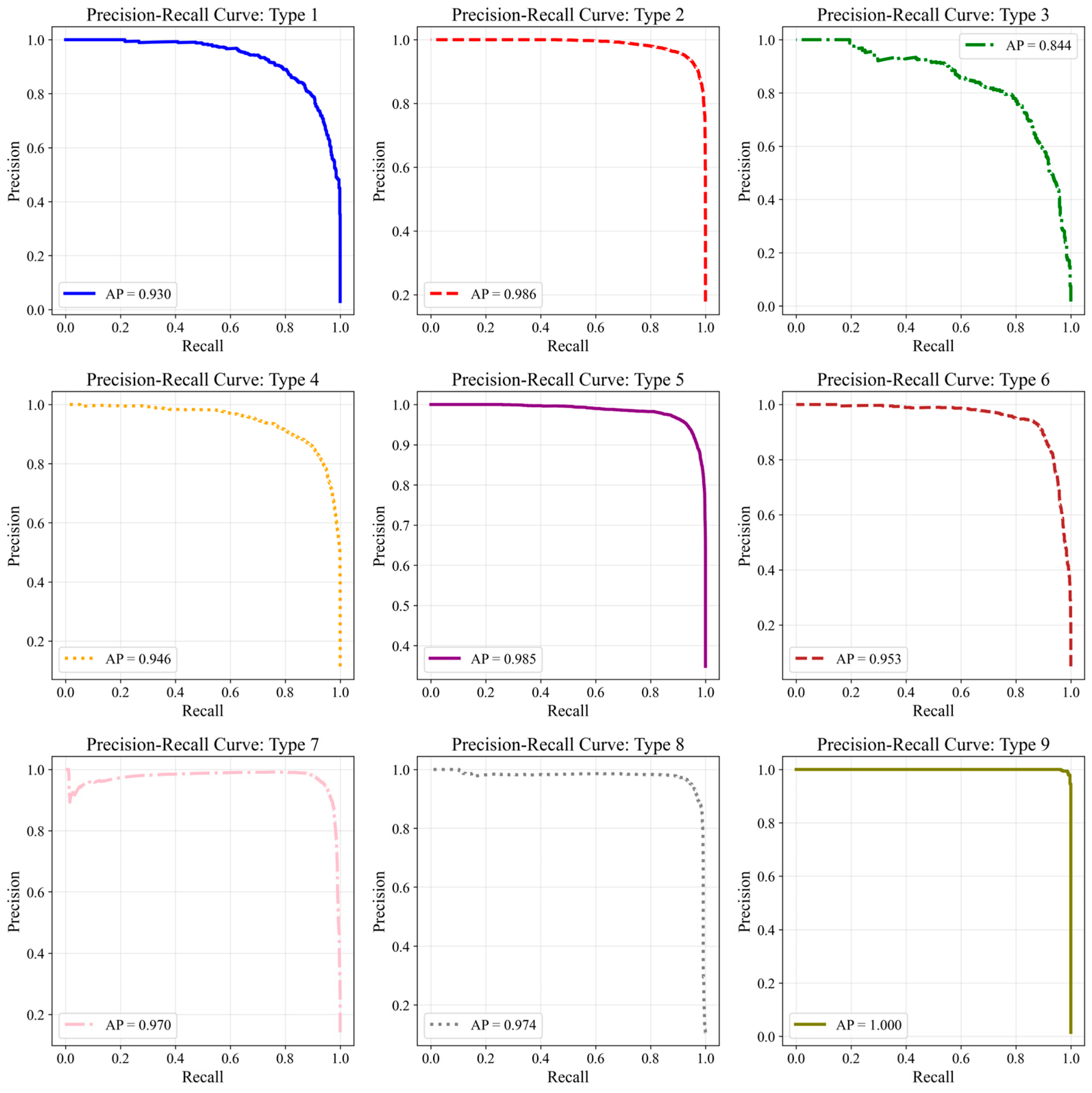 Soils with distinctive CPT signatures, such as Type 2, 5, 7, 8, and 9, exhibit P-R curves that remain close to the upper-right region of the P-R space, indicating high precision across the full recall spectrum. These soils typically show clear behavioral contrasts in cone tip resistance (qt), specific penetration resistance (ps), sleeve friction (fs), and friction ratio (Fr), enabling the model to differentiate them effectively across a wide range of thresholds. For example, Type 9 displays the highest AP, approaching unity, consistent with the high resistance and low friction ratio typical of sandy soils, which produces well-separated feature clusters. Similarly, Types 2, 5, and 8 benefit from large sample sizes and stable CPT response patterns, leading to smooth P-R curves and minimal degradation at high recall.