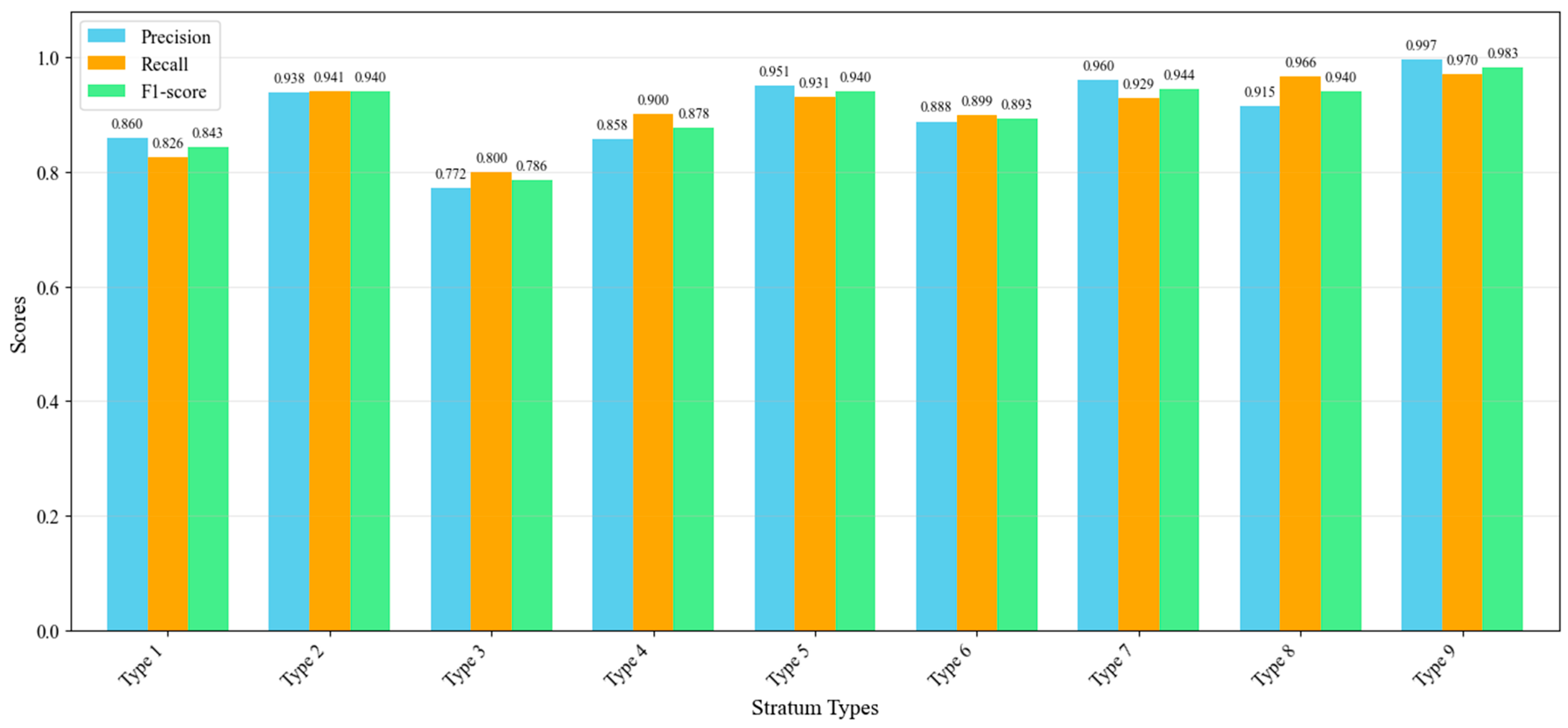 Soils with clear mechanical signatures and abundant samples, including Types 2, 5, 7, 8, and 9, exhibit the strongest performance, with all three metrics exceeding 0.910. These soil types typically display well-defined CPT responses, enabling the model to distinguish them with both high precision and high recall, which is reflected in their near-perfect F1-scores.
