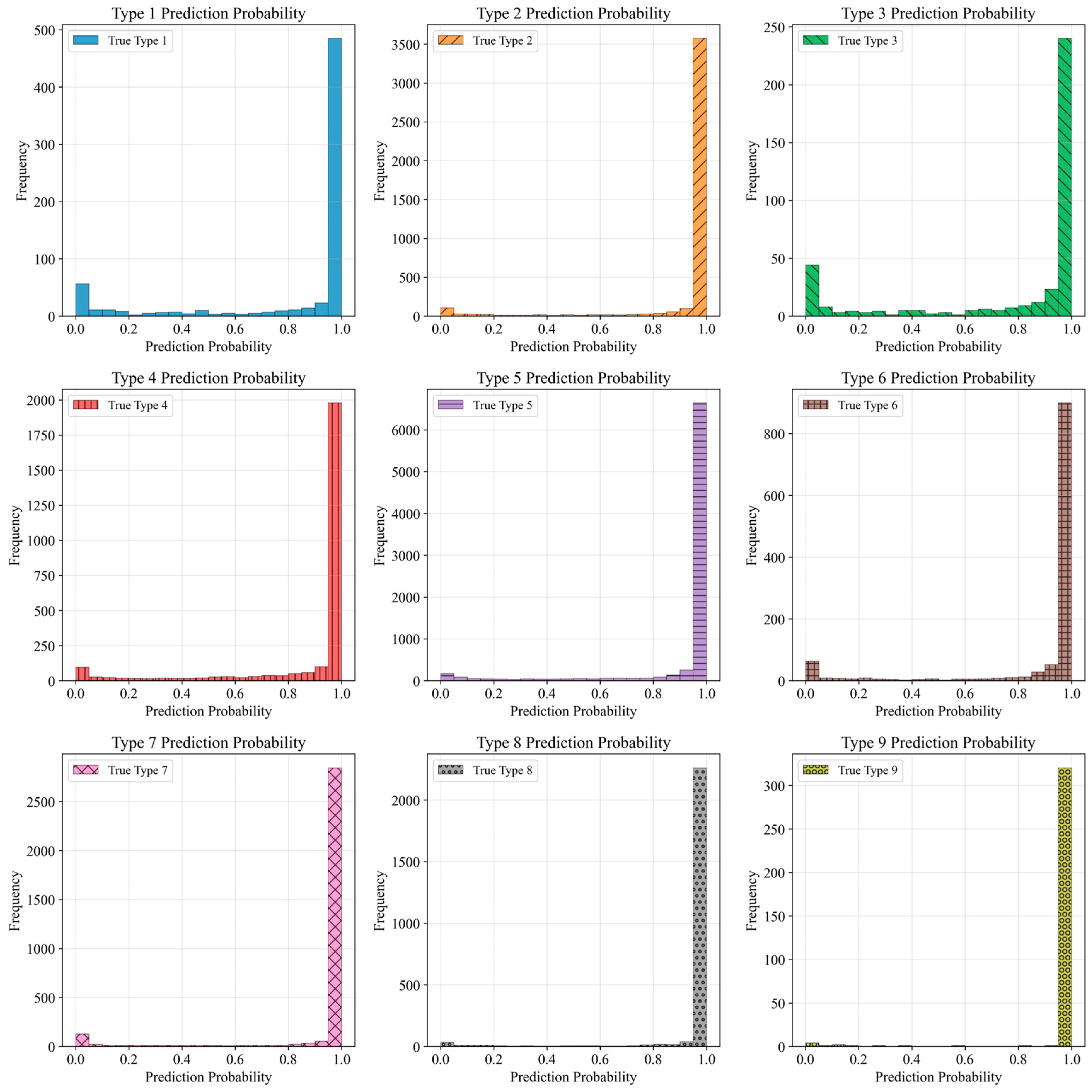 In contrast, Types 1 and 3 show more dispersed probability distributions. Type 1 exhibits a broader spread from 0.1 to 1.0, with a less pronounced peak, reflecting the heterogeneous composition of fill material and its variable CPT response. Type 3 shows an even more pronounced long-tail distribution, with many samples receiving intermediate confidence scores. These distributions align with their lower AP values and with the confusion matrix results, where Type 3 in particular shows misclassification into Type 2. The probability dispersion therefore reflects underlying geotechnical ambiguity: transitional fines with mixed clay–silt characteristics naturally produce CPT signatures that are less distinct and therefore more difficult for the model to classify with high certainty.