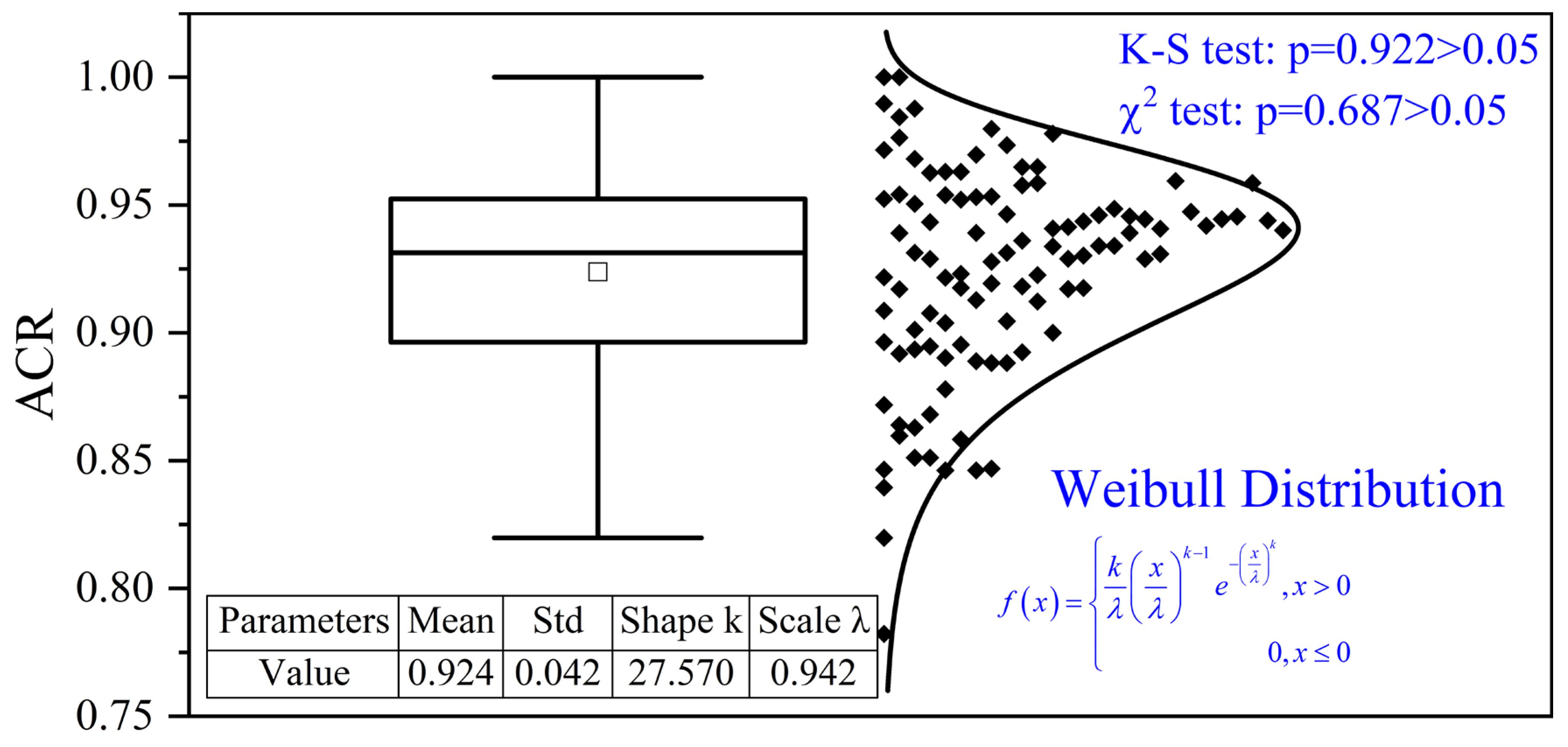 To characterize the statistical distribution of ACR, a Weibull probability model was fitted to the 340 ACR values. The fitted parameters include a shape parameter k = 27.570 and a scale parameter λ = 0.942. Both the Kolmogorov–Smirnov test and chi-square test fail to reject the null hypothesis that ACR follows a Weibull distribution, confirming the adequacy of this probabilistic representation. The narrow confidence intervals further support the stability of the fitted distribution.