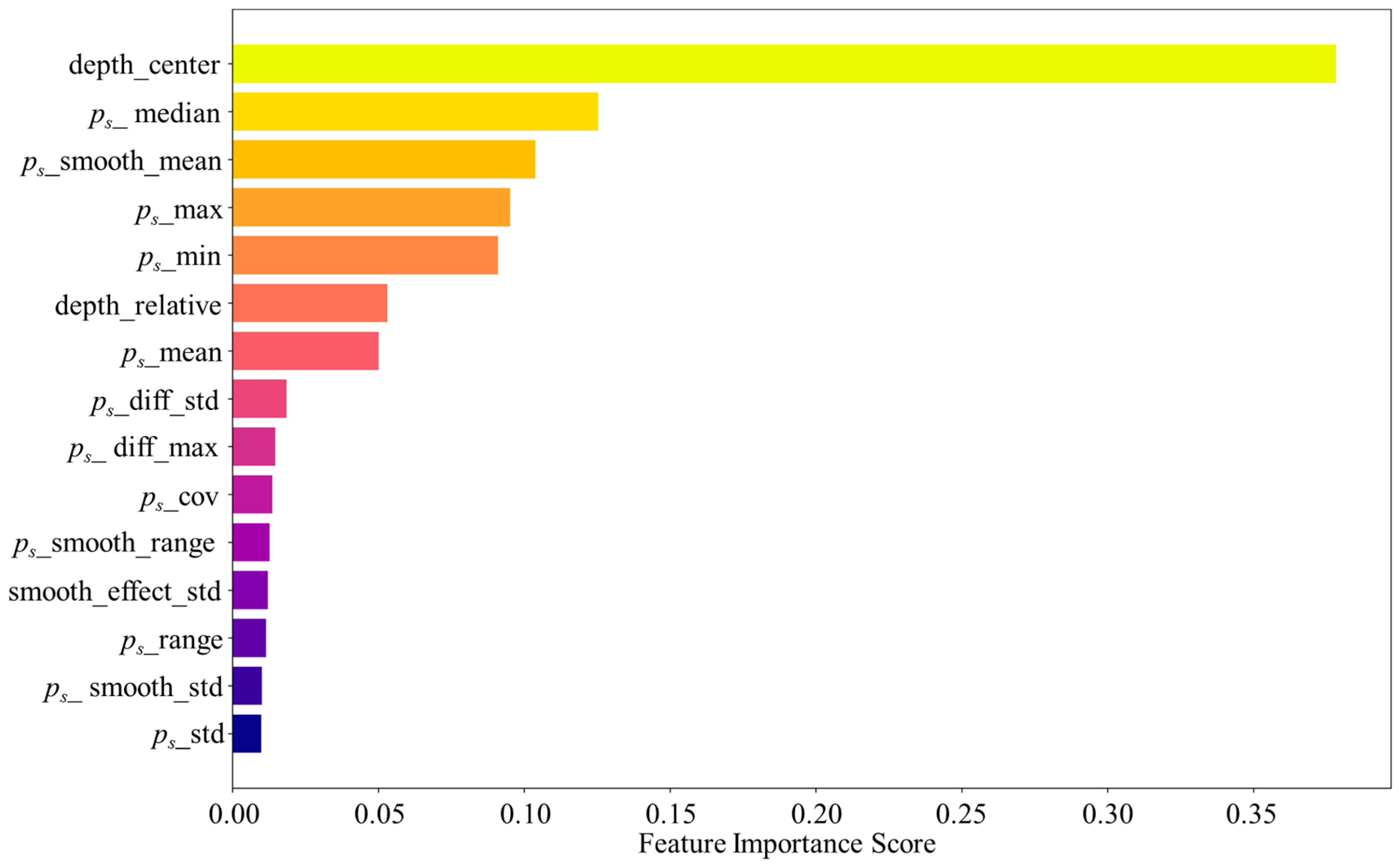 Lower-ranked features such as ps_diff_max, ps_diff_std, and ps_cov contribute incremental value by capturing localized transitions and micro-variability within the CPT signal. Although their importance is smaller, these descriptors help distinguish transitional soils (e.g., muddy silty clay or mixed silt–clay layers), consistent with the P-R curve behavior and confusion matrix analysis. The relatively low importance of ps_std and ps_smooth_std suggests that broad-scale variability is less informative than local contrasts and representative central tendencies.