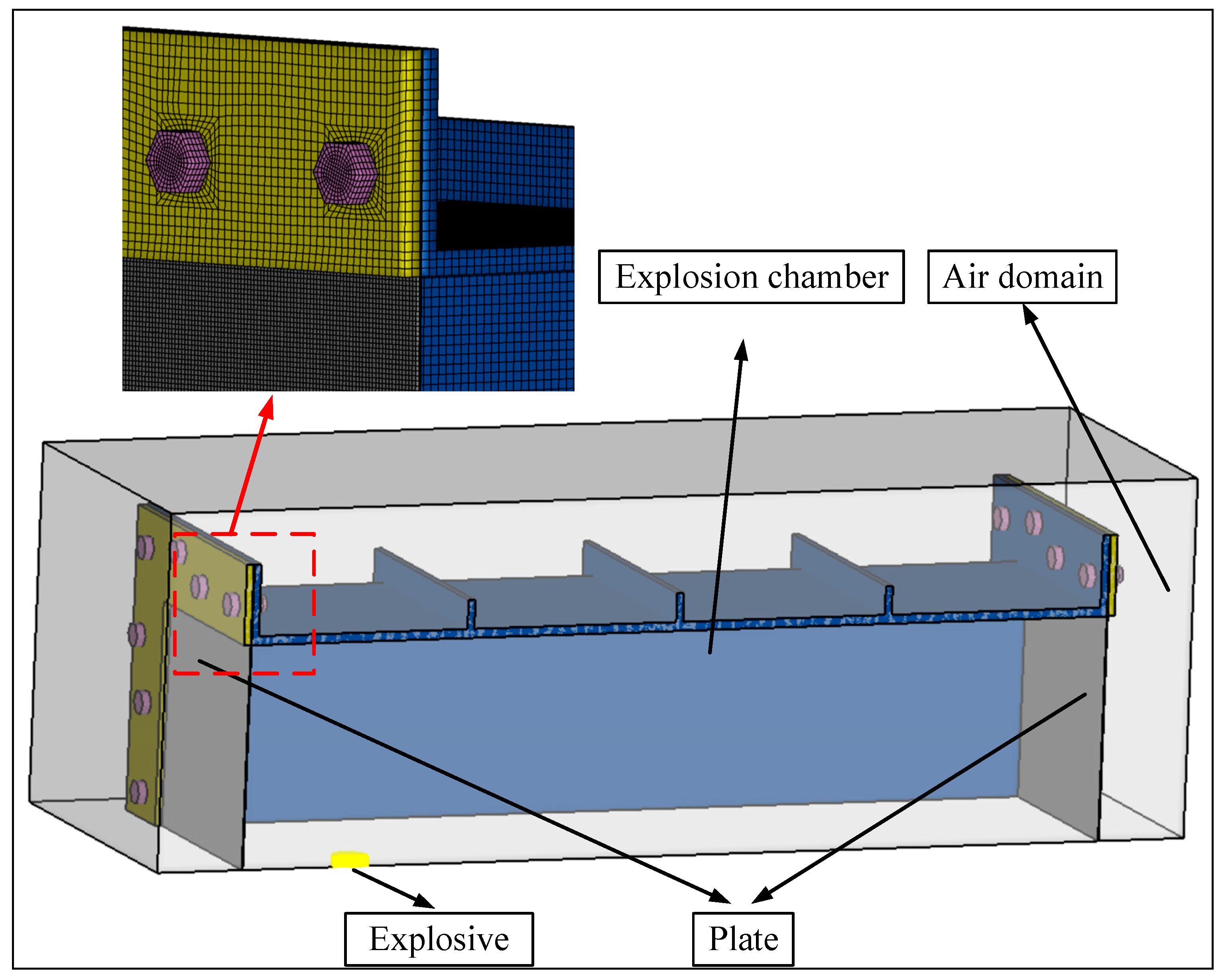 - Zhao, N.; Yao, S.J.; Zhang, D.; Lu, F.Y.; Sun, C.M. Experimental and numerical studies on the dynamic response of stiffened plates under confined blast loads. Thin-Walled Struct. 2020, 154, 106839. [Google Scholar] [CrossRef]