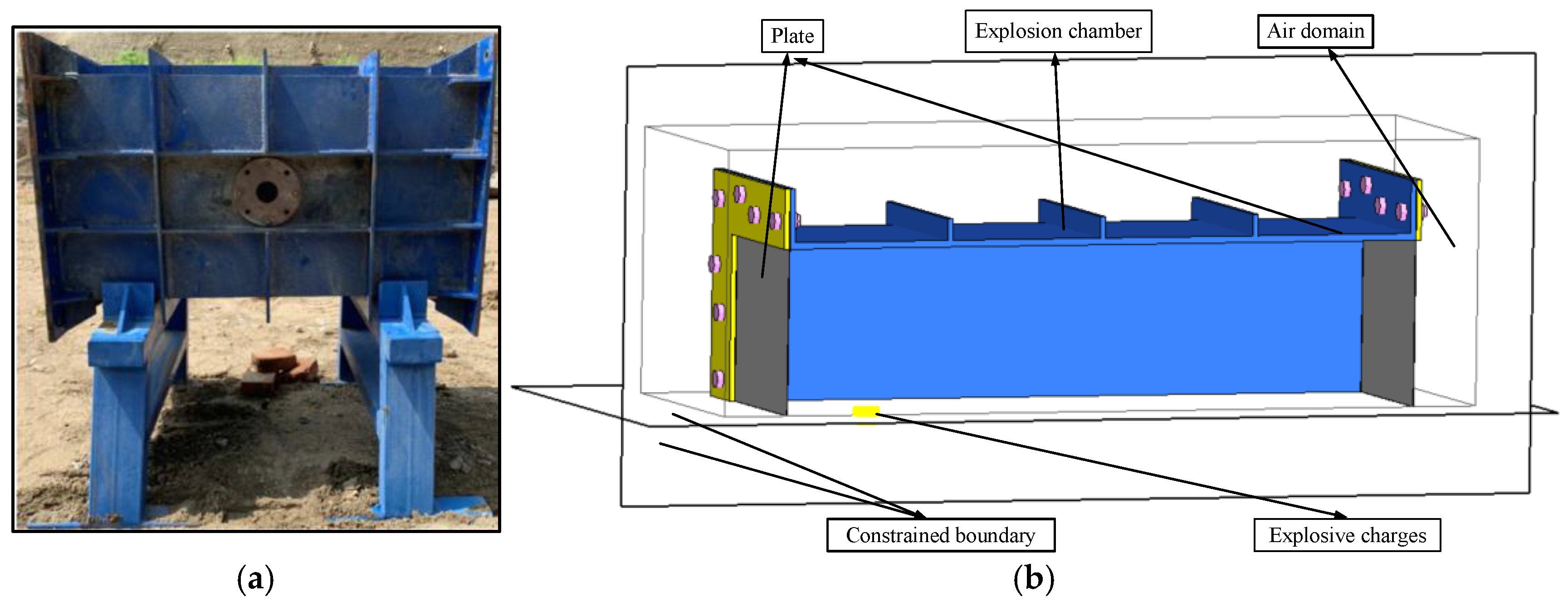 - Zhou, H.; Yue, X.; Zheng, C.; Zhu, Z.; Lu, A.; Kong, X.; Wu, W. Dynamic behavior of steel plates subjected to confined blast loading considering afterburning effect. Int. J. Impact Eng. 2024, 188, 104934. [Google Scholar] [CrossRef]