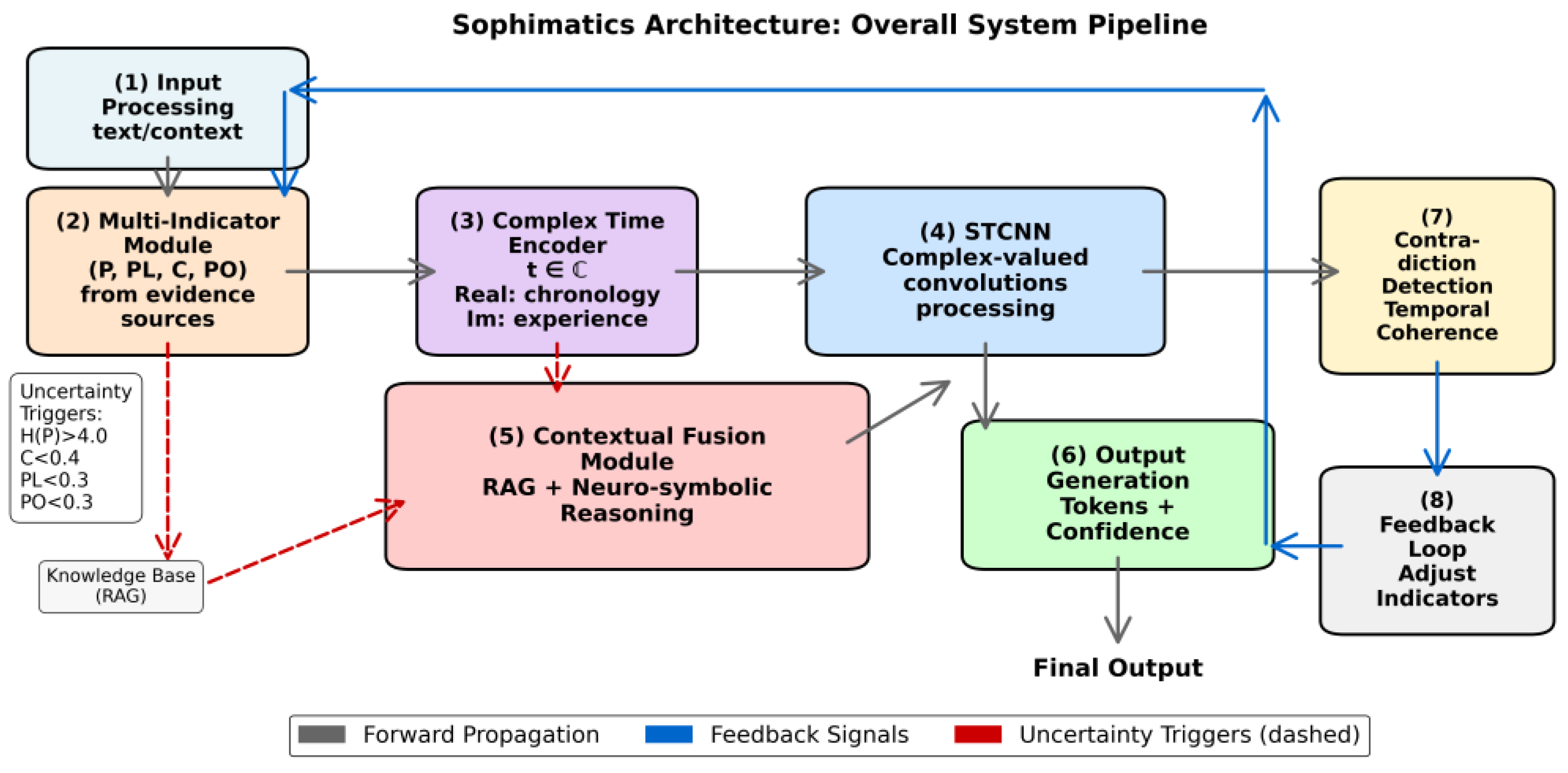 | Input: Context x1:k, max_length n, knowledge_base KB Output: Generated sequence y1:n with confidence scores conf1:n 1. Initialize: complex embedding z0 from context encoding 2. For t = 1 to n: from current state using formulas in Section 5.1 as per Section 5.2 using complex convolutions (Section 5.3) d. Check uncertainty triggers (Section 5.4): < 0.3 THEN Retrieve relevant documents from KB ← RAG_update(KB, context) Go to step (b) e. Check logical constraints via LTN/DeepProbLog (Section 5.4): IF Sat(φ) < 0.7 for any constraint φ THEN Apply soft revision or reject token Go to step (b) f. Check temporal contradiction (Section 5.4): IF contradiction(t, τ) = 1 for any significant past token τ THEN Apply soft revision: adjust generation to increase coherence OR flag uncertainty and reduce confidence from output distribution h. Compute confidence score: is contradiction penalty 3. Return (y1:ₙ, conf1:ₙ) |