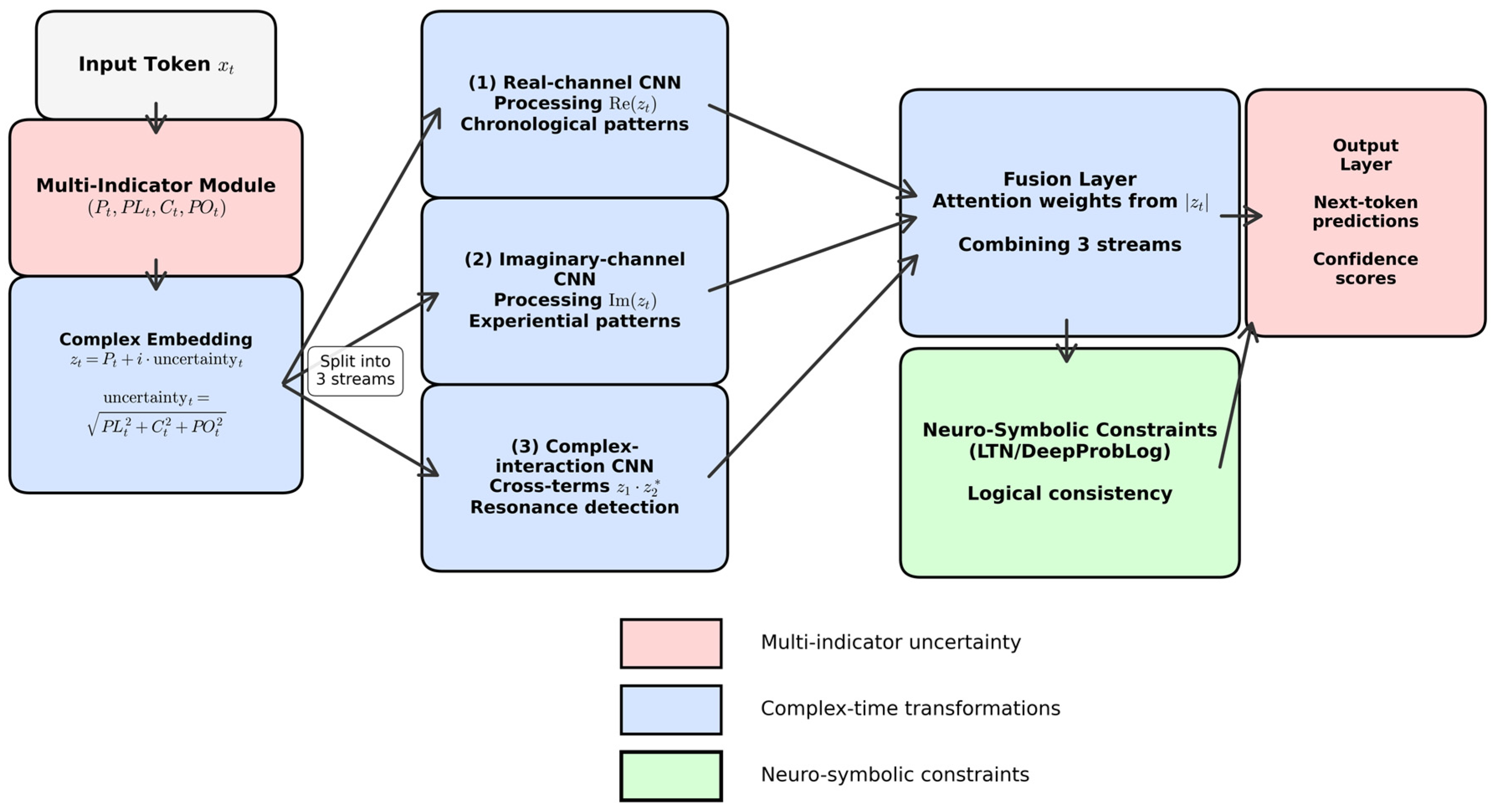 - Complex time (ours): Continuous T ∈ ℂ, fully differentiable, bidimensional (chronology + experience), enabling gradient-based learning where the model learns to assign experiential weights based on predictive utility. Unlike prior complex-valued neural networks used in signal processing, our decomposition specifically targets temporal-experiential separation for language understanding.