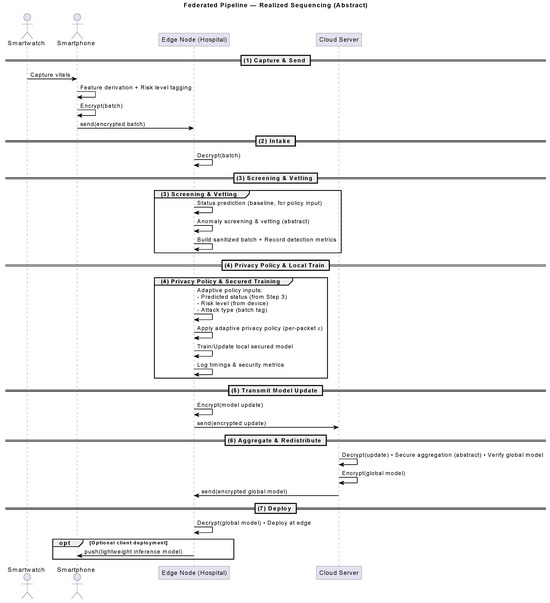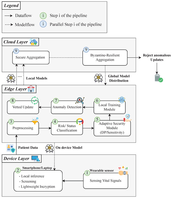 - Device Layer: At the lowest level, wearable sensors (e.g., smartwatches) collect physiological signals and transmit them to a personal gateway device, typically a smartphone or laptop (step 1 in Figure 3). This gateway performs lightweight data pre-screening and, when applicable, executes on-device inference to provide immediate feedback (step 2 in Figure 3). Security at this layer prioritizes confidentiality using lightweight encryption and early-stage anomaly detection to filter corrupted signals prior to transmission.