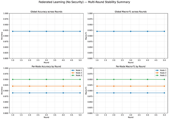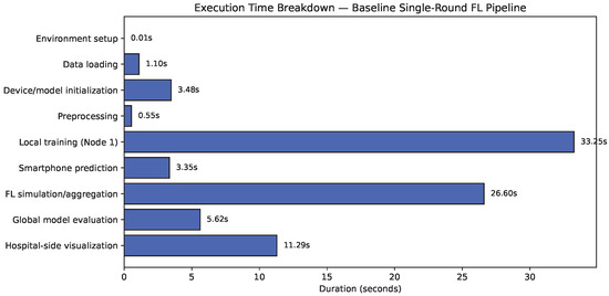 To quantify the computational impact of the proposed defenses, we measured per-round execution times for the baseline (no security), fixed-privacy, and adaptive-privacy configurations. All setups were run on identical dataset sizes (133,919 samples per edge node) to ensure comparability. Results indicate that adaptive security introduces only moderate, bounded overhead (0.3–0.9 s compared to fixed privacy) while remaining compatible with real-time execution constraints in federated clinical environments, confirming negligible latency at the edge. Figure 17 reports absolute runtimes, while Figure 18 expresses the same results as relative overhead percentages with respect to the unsecure baseline.