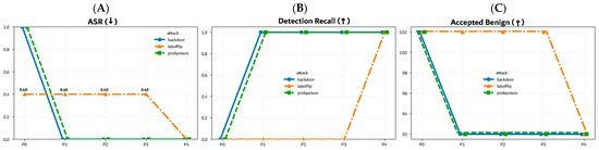 We note that for Probabilistic Poisoning (PP) and Backdoor (BD) attacks, the final operating point coincides with P3 (the stack that achieved ASR = 0 in the stable runner); P4 adds the envelope test only for Label-Flip, which is feature-transparent.