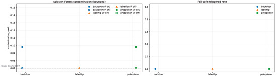 Detector operating points under bounded contamination. Left: Isolation Forest contamination levels selected for each attack type. Right: Corresponding fail-safe trigger rates. Marker color and shape denote the attack type, while filled and hollow markers indicate detector enabled (IF on) and disabled (IF off), respectively. Note: For the labelflip scenario, IF-on and IF-off operating points coincide numerically, causing the filled marker to visually occlude the hollow marker.