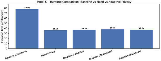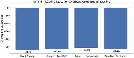 Together, Panel C (Figure 17) and panel E (Figure 18) show that incorporating dynamic per-packet policies maintains execution times within a narrow band (36–38 s), adds less than 2.5% extra cost over fixed privacy, and remains far below the baseline processing time. Panel D (Figure 19) shows that Runtime overhead remains minimal under adaptive privacy (≃10–13%), with per-round execution varying by less than 0.5 s across attacks. This indicates that integrating dynamic security does not compromise real-time performance.