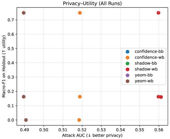 As shown in Table 7 and Figure 20, all membership inference attacks exhibit near-chance AUC and low advantage, with no meaningful privacy degradation across black-box and limited white-box settings. Some evaluated configurations yield nearly identical privacy–utility operating points, causing their visual representations to overlap in Figure 20; For clarity, these evaluated configurations are differentiated in the legend and summarized numerically in Table 7.
