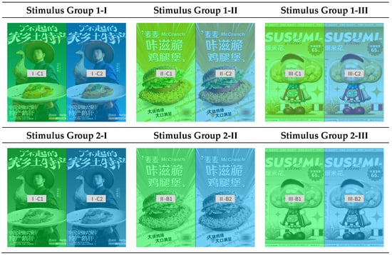 The static posters were juxtaposed with their corresponding dynamic posters within the same frame, yielding six sets of comparative videos contrasting static and dynamic posters. These six comparison videos were divided into two stimulus groups based on colour versus B&W posters. As shown in Figure 3, both stimulus groups played the following sequence: Lu’an Goose Liver poster, McChicken Thigh Burger poster, Pop Mart poster. Each comparison video played for 10 s.