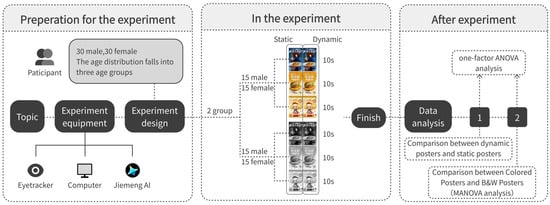 The experiment was conducted using two stimulus groups. Participants viewed stimuli from a distance of 60 cm from the screen centre. Each stimulus group was presented within a 1920 × 1080 pixel rectangle. Following viewing tests with different individuals prior to the formal experiment, the total viewing duration for each stimulus group was set to 30 s, with each comparison poster viewed for 10 s. To eliminate extraneous variables, participants received a brief introduction to the procedure and relevant precautions prior to the experiment.