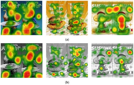 Participants’ heat maps after watching static and dynamic posters at the same time. (a) Heat map obtained from 30 participants after watching colour static posters and dynamic posters at the same time. (b) Heat map obtained from 30 participants after watching black and white static posters and dynamic posters at the same time.