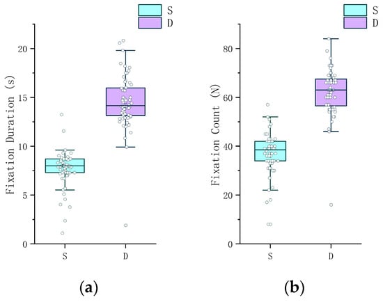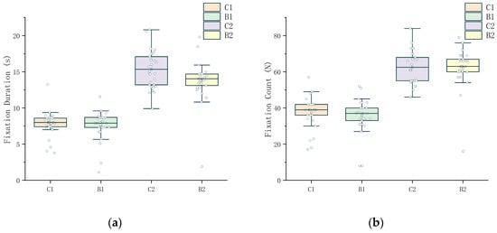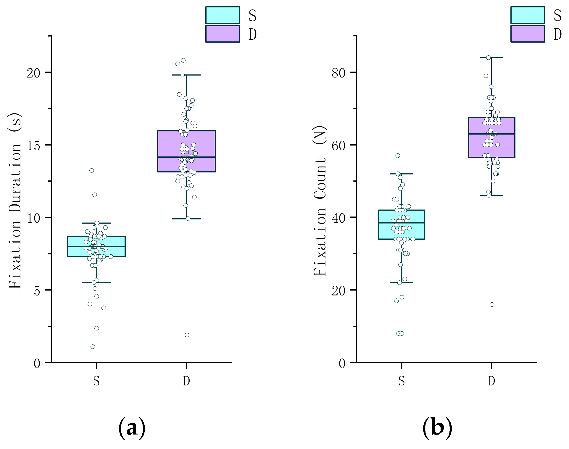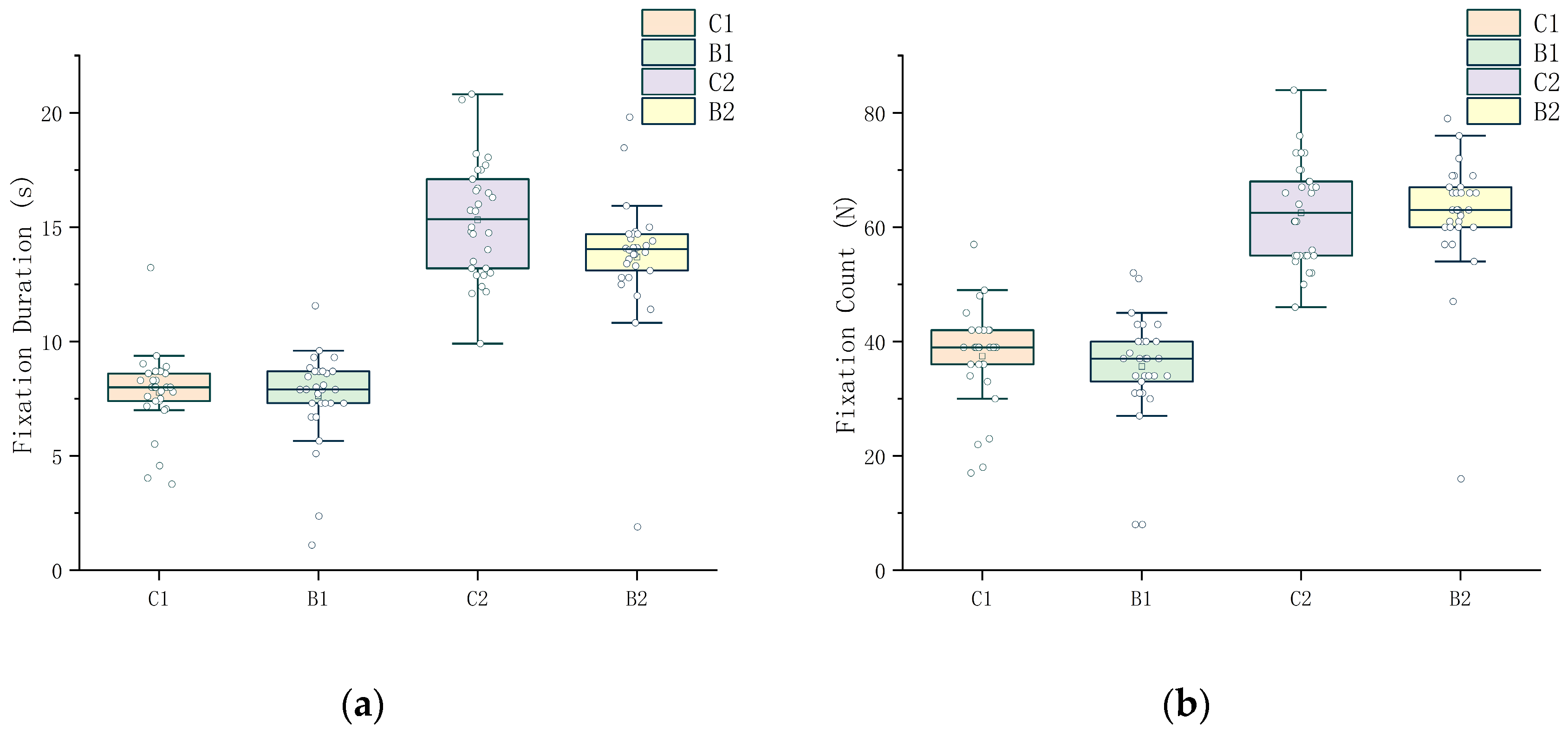 For both dynamic and static stimuli, the fixation duration for C1 was 233.37 s, while that for C2 was 459.55 s. The fixation duration for B1 was 228.73 s, and for B2, it was 410.69 s. The fixation count for C1 was 1123, while that for C2 was 1875. The number of fixations for B1 was 1069, while that for B2 was 1868. The total fixation duration for S was 462.10 s, whereas that for D was 870.24 s, with S being lower than D. The total fixation count for S was 2192, in comparison to 3743 for D. Specific data are shown in Table 3.