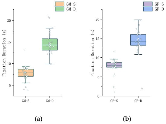 By gender, the total fixation duration of attention for GM was 672.82 s, while that for GF was 659.52 s, with no significant difference between GM and GF. Specific data is presented in Table 4.