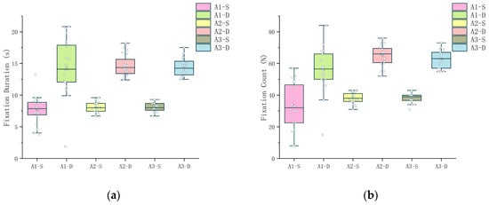 In terms of age, the fixation duration for A1-S was 138.90 s, while that for A1-D was 287.64 s, indicating a significant effect, F = 39.078, p < 0.001. The fixation duration for A2-S was 161.60 s, while that for A2-D was 293.90 s, indicating a significant effect, F = 291.689, p < 0.001. The fixation duration for A3-S was 161.60 s, while that for A3-D was 288.70 s, indicating a significant effect, F = 330.338, p < 0.001. Detailed data are presented in Table 5 and Figure 10. This indicates that participants’ age had no influence on the study of attention capture efficiency between dynamic and static posters.