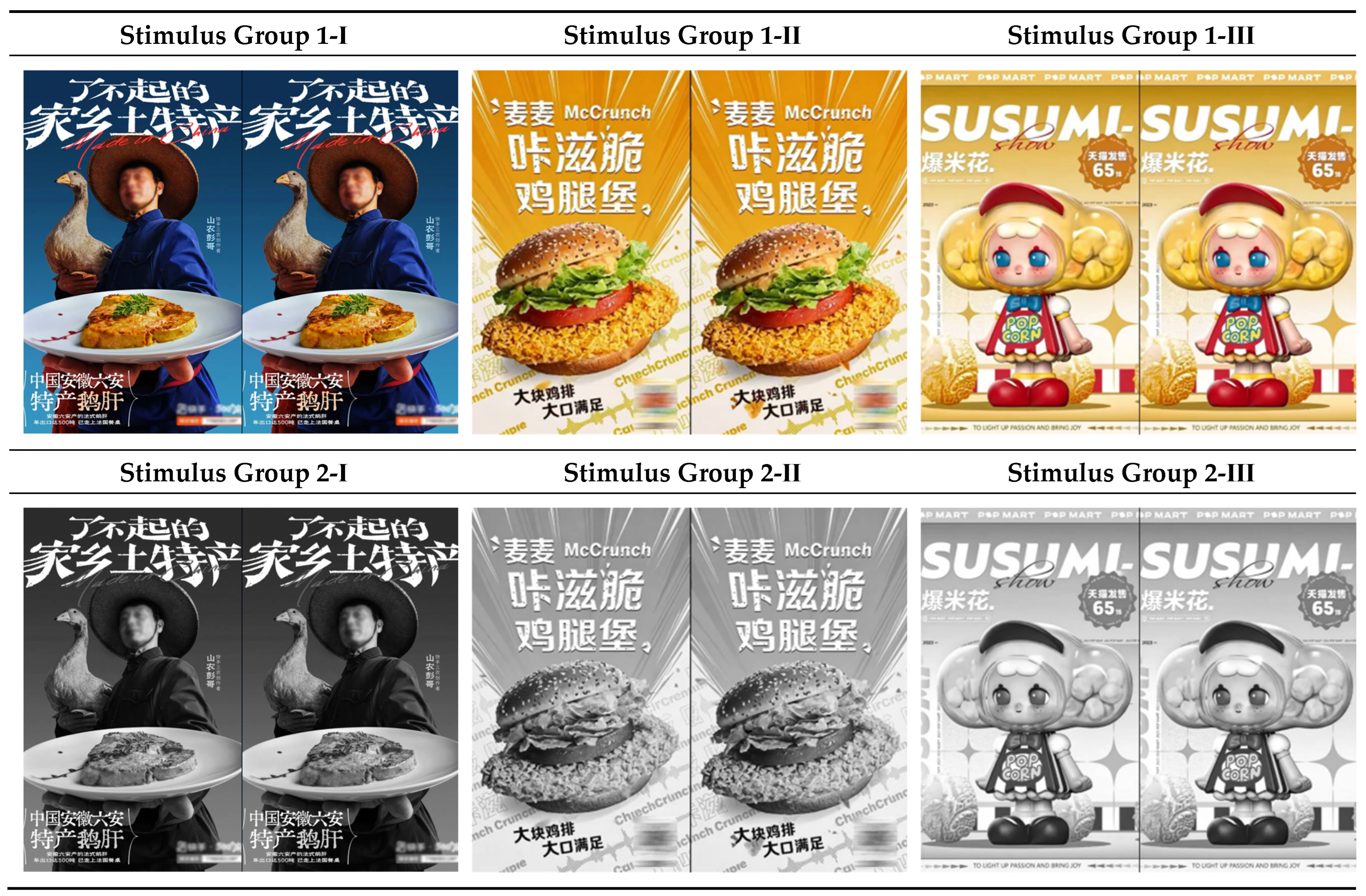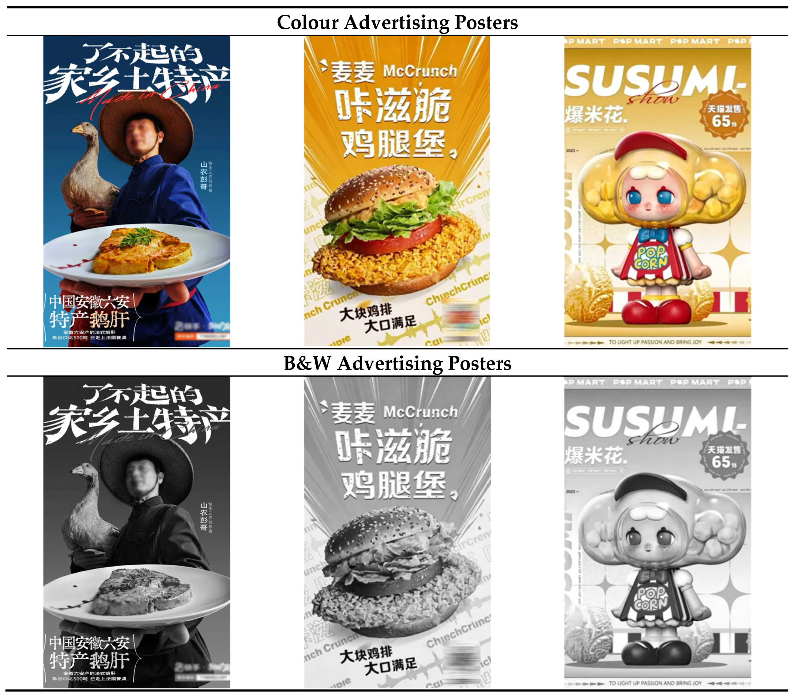 Three colour advertising posters were selected: the Lu’an Goose Liver poster, the McChicken Thigh Burger poster, and the Pop Mart poster. Using Jiemeng AI (ByteDance’s JinYing team has developed a generative artificial intelligence creation platform, Image Model 2.1), dynamic processing was applied to the images and text of the three posters, including shaking, fading, and cut-ins, to generate corresponding dynamic posters. Using Adobe Photoshop (2024 edition, professional image processing software developed by Adobe System) and Jianying (15.8.1, Android, updated on 10 March 2025, video editing application developed by Shenzhen FaceMong Technology Co., Ltd., Shenzhen, China, a subsidiary of Douyin), the colour was removed from the three colour static posters and the three colour dynamic posters, generating corresponding B&W static posters and B&W dynamic posters, as shown in Figure 1 and Figure 2.