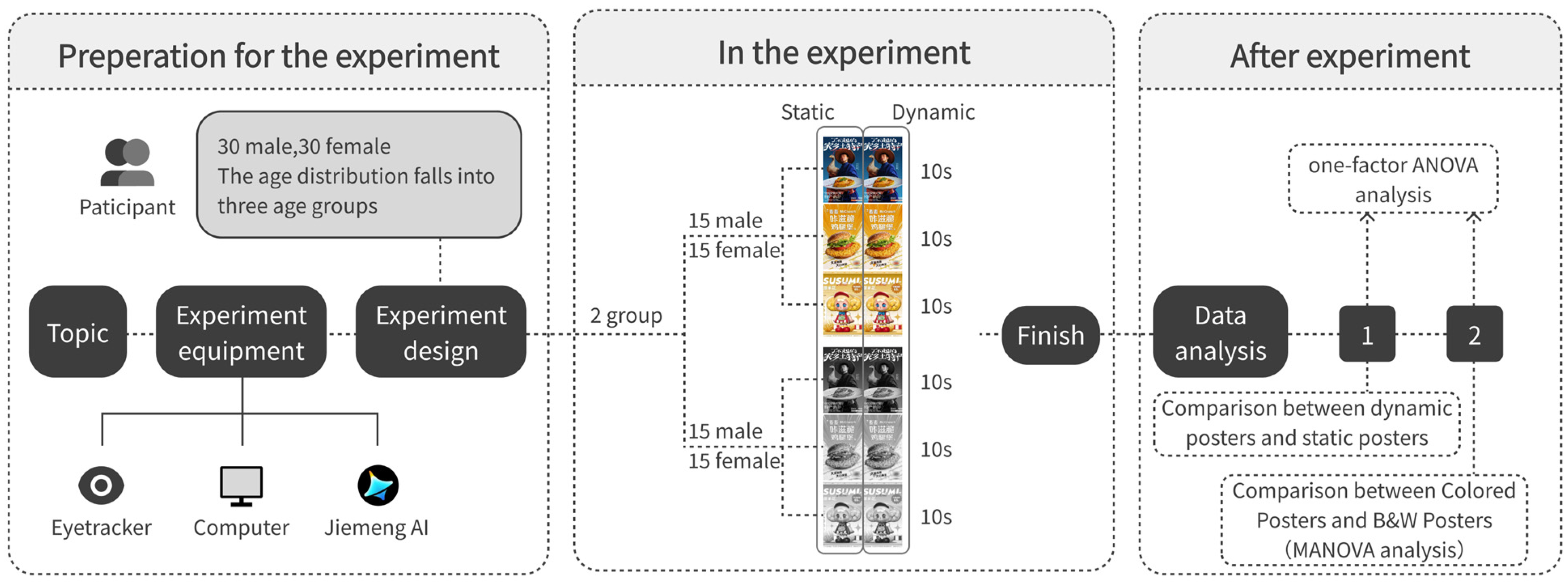 This study employed eye-tracking technology to analyse differences in participants’ attentional focus towards advertising posters with varying design formats (dynamic/static, colour/B&W). User tracking data was integrated to determine which design format proved more compelling. Experimental findings are as follows:
