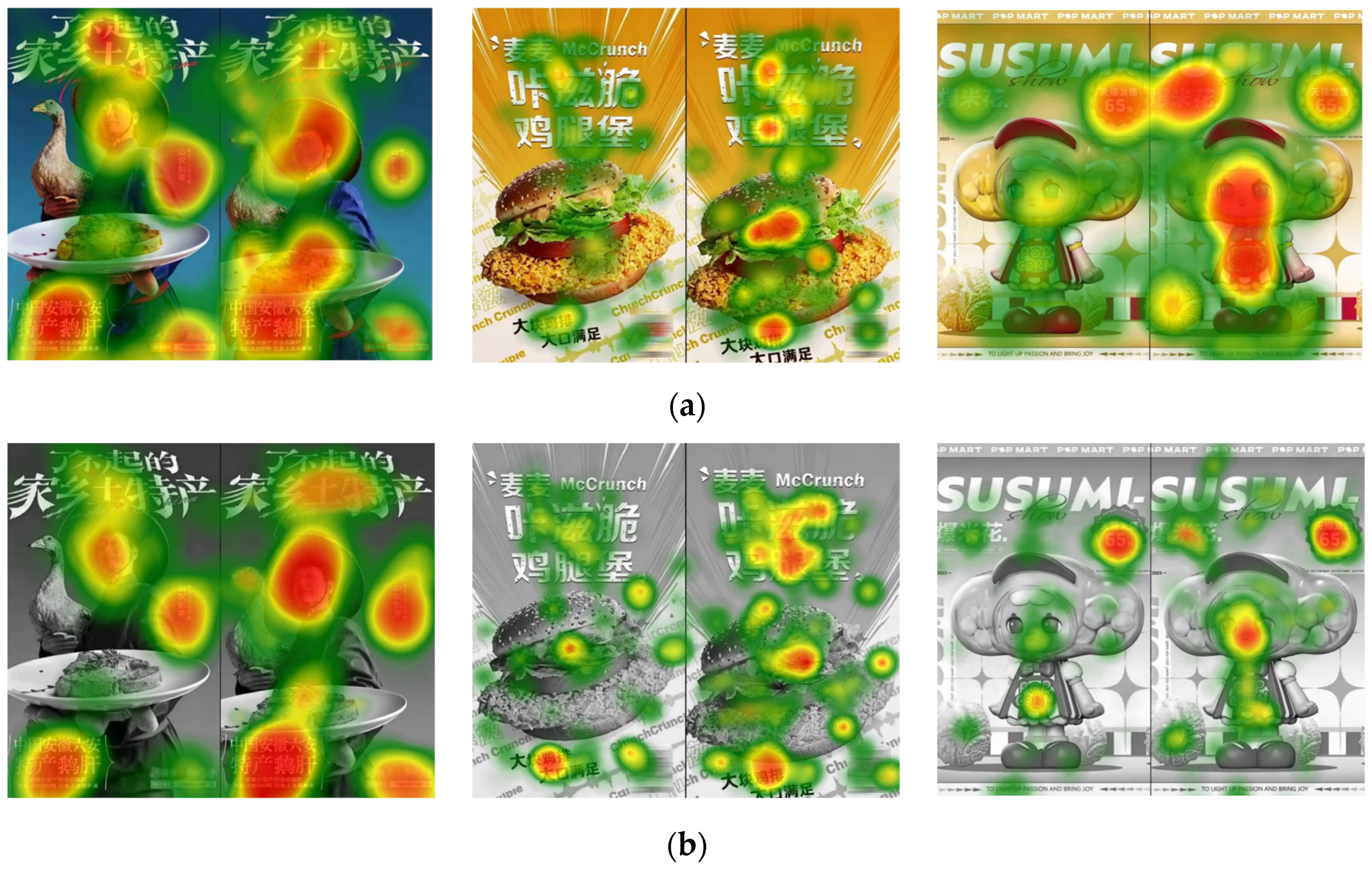We must clarify that the eye-tracking experimental paradigm employed in this study is fundamentally designed as an “effectiveness evaluation method”, not as an “individual clinical diagnostic tool”. Its specific objective is defined as: quantitatively comparing the differential effects of two design variables—“dynamic/static” and “colour/black-and-white”—on group attention within a controlled environment to test visual cognition theories to provide commercial poster designers with an evidence-based hierarchical decision reference (i.e., prioritizing dynamics over colour) for optimising design resource allocation and enhancing advertising’s attention-capturing efficiency. This study establishes a group-level, design-oriented evaluation framework aimed at assessing the effectiveness of design rather than diagnosing the cognitive state or abilities of individuals.