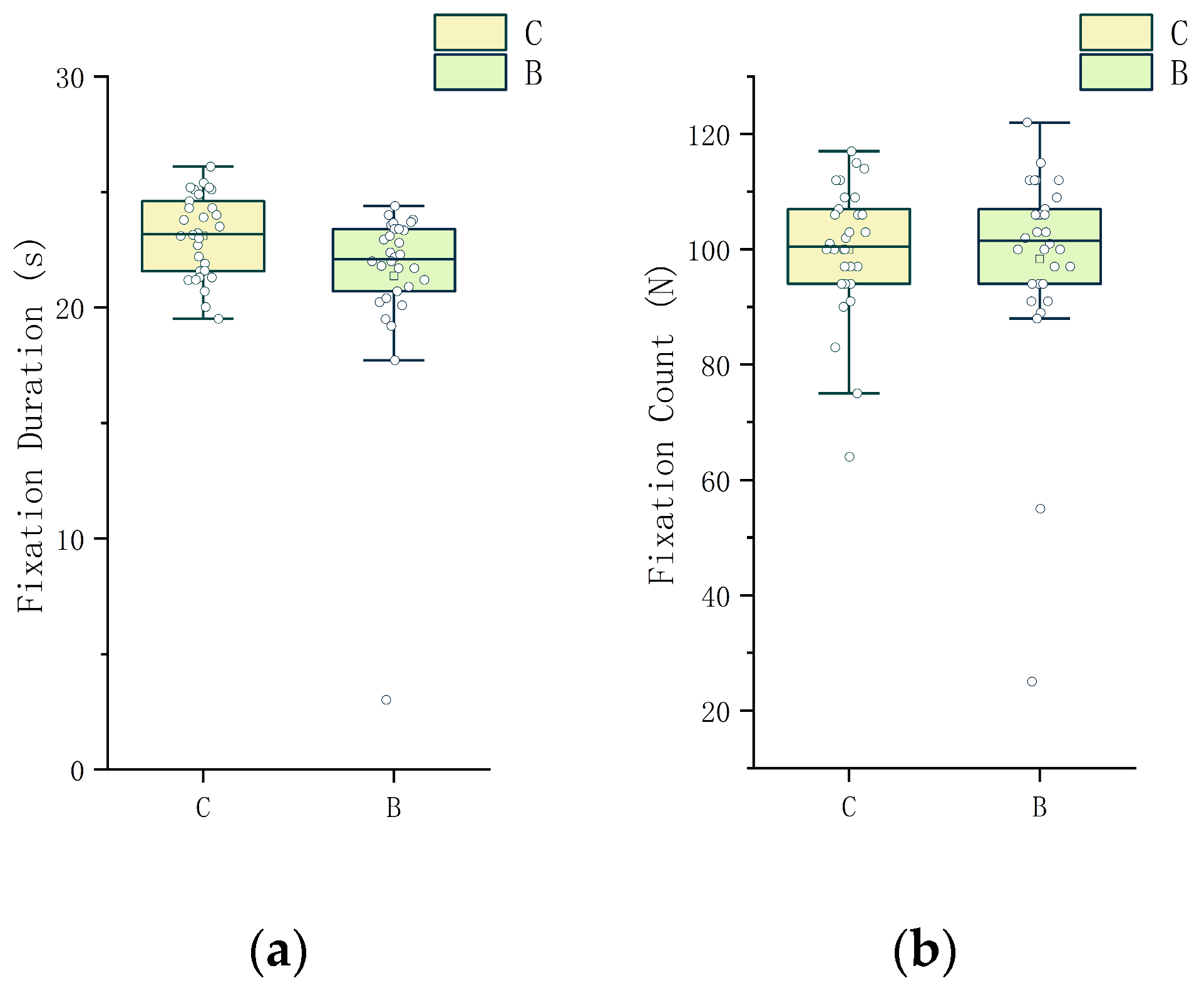 For fixation duration, C and B showed a significant effect, F = 5.067, p = 0.028 < 0.05. The data indicate that C outperformed B in terms of fixation duration and fixation count, demonstrating that colour holds a greater advantage than B&W in capturing attention.