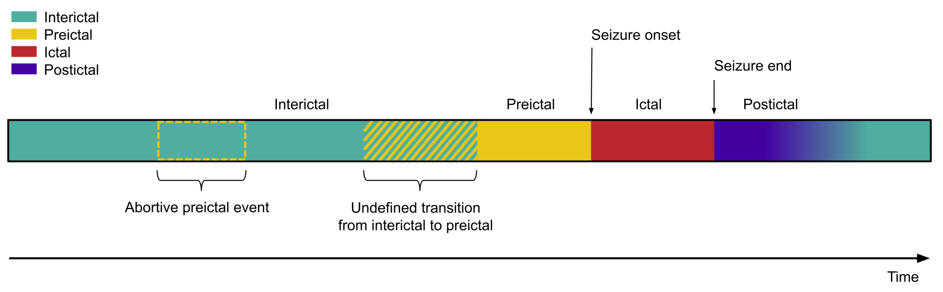 - Finally, the interictal state is often defined simply as all remaining periods outside the preictal, ictal, or postictal windows. It is inherently dependent on the delineation of seizure-related states, and consequently liable to error.