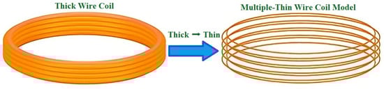 Figure 1 illustrates a scenario where an equivalent current exists in the current loop, characterized by ampere-turns. Such a model is the single thin wire (STW) model [28,29]. The equivalent current is related to the actual one by , where represents the actual current in the l-th coil, and is the number of turns in the real multi-turn coil with finite dimensions (width and thickness), which in approximate calculations can be modeled by an infinitely thin circular wire loop carrying the equivalent current. In cases where the coil current is not a direct current but a low-frequency sine wave given by , where represents the RMS value of the current in the l-th coil.