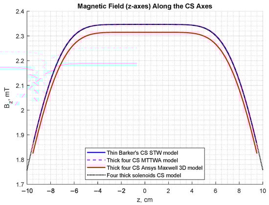 The CS classification was originally introduced in [43,44]. A coil system is said to ensure a field uniformity of the N-th order when the first N terms of the Taylor series expansion of the MF at the center of symmetry, besides the first one, can be made zero by properly choosing the coil system parameter values. In a symmetrical four-CS (see Figure 1) whose coil axes coincide (the z-axis), the planes of the coils are perpendicular to this axis, and the currents denoted by and have the same flow direction, this arrangement can ensure a field uniformity of the sixth order [44] if
