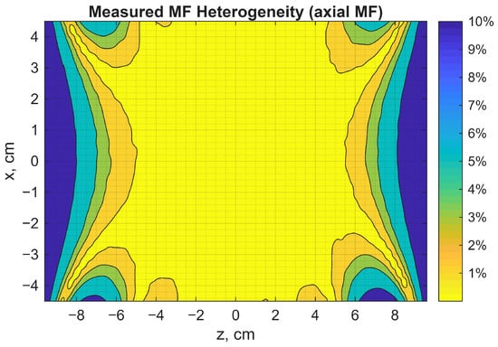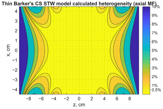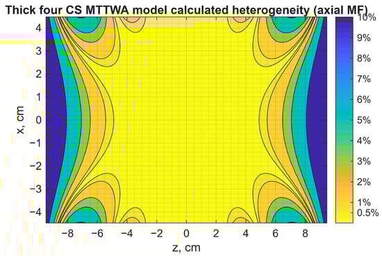 The latter estimate is of interest to researchers when only the field magnitude is of interest, and its direction is not important. In cases where the MF axial component is as dominant as it is for coaxial symmetrical CSs, the field inhomogeneity is determined with respect to the axial component (here the axial axis is the z-axis) of the field by choosing the magnitude of a MF on the axis of the symmetrical CS center as the reference field, and the heterogeneity is calculated using Formula (2) as follows: