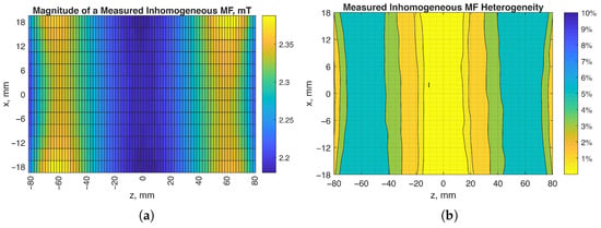 The result of the experiment for generating inhomogeneous MF is shown in Figure 15. This example illustrates the current values and ratios, which were chosen to minimize large differences in the magnitude of an MF compared to previous experiments. The currents in each coil of the pair of coils were chosen to be in the outside coils and in the inner coils, and the ratio of the current ratios was then 3.25. This choice was made to ensure the convenient possibility of quickly obtaining inhomogeneous fields with the existing exposure system. During the measurements, the measuring probe moved along the z axis with a step of 2 , along the x axis with a step of 3 , and at each point, the probe made only one measurement.