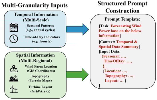 We integrate multi-granularity temporal and spatial information as prompt inputs to the frozen LLM. Temporal information includes seasonal patterns, time-of-day indicators, and historical wind power data, while spatial information comprises wind farm location, topography, and turbine layout. This structured prompting enables WPFGPT to recognize and assimilate spatio-temporal dependencies across multiple scales and geographic regions, thereby enhancing forecasting accuracy and interpretability.