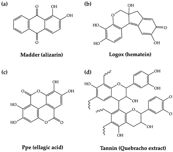 Chemical structures of: (a) madder, the natural dye, and (b) Logox, (c) Ppe, (d) Tannin, the main biomordant molecules and colour modifiers used in this study [29,34,40,60,61].